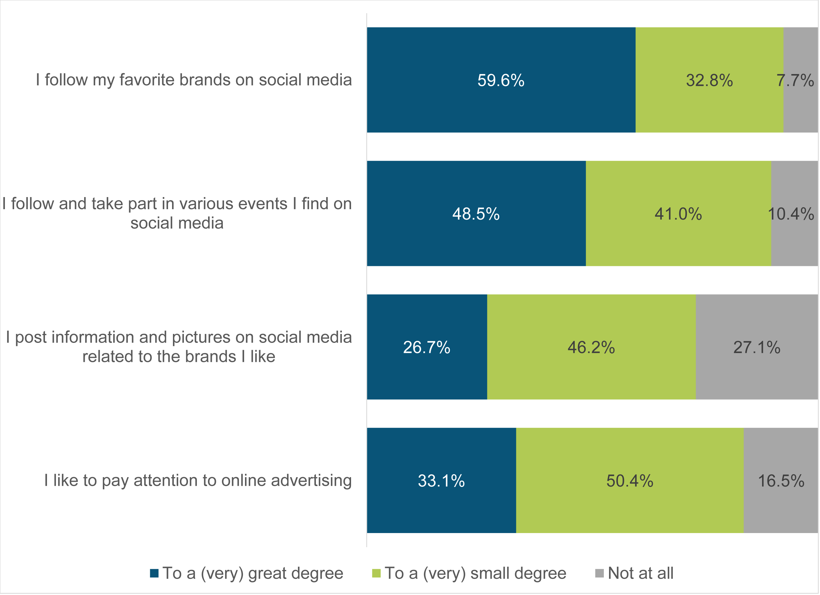 Urmărirea pe rețelele sociale a bradurilor, produselor și serviciilor preferate este foarte întâlnită, cu 58.8% din respondenți declarând că fac acest lucru la nivel mare și foarte mare.