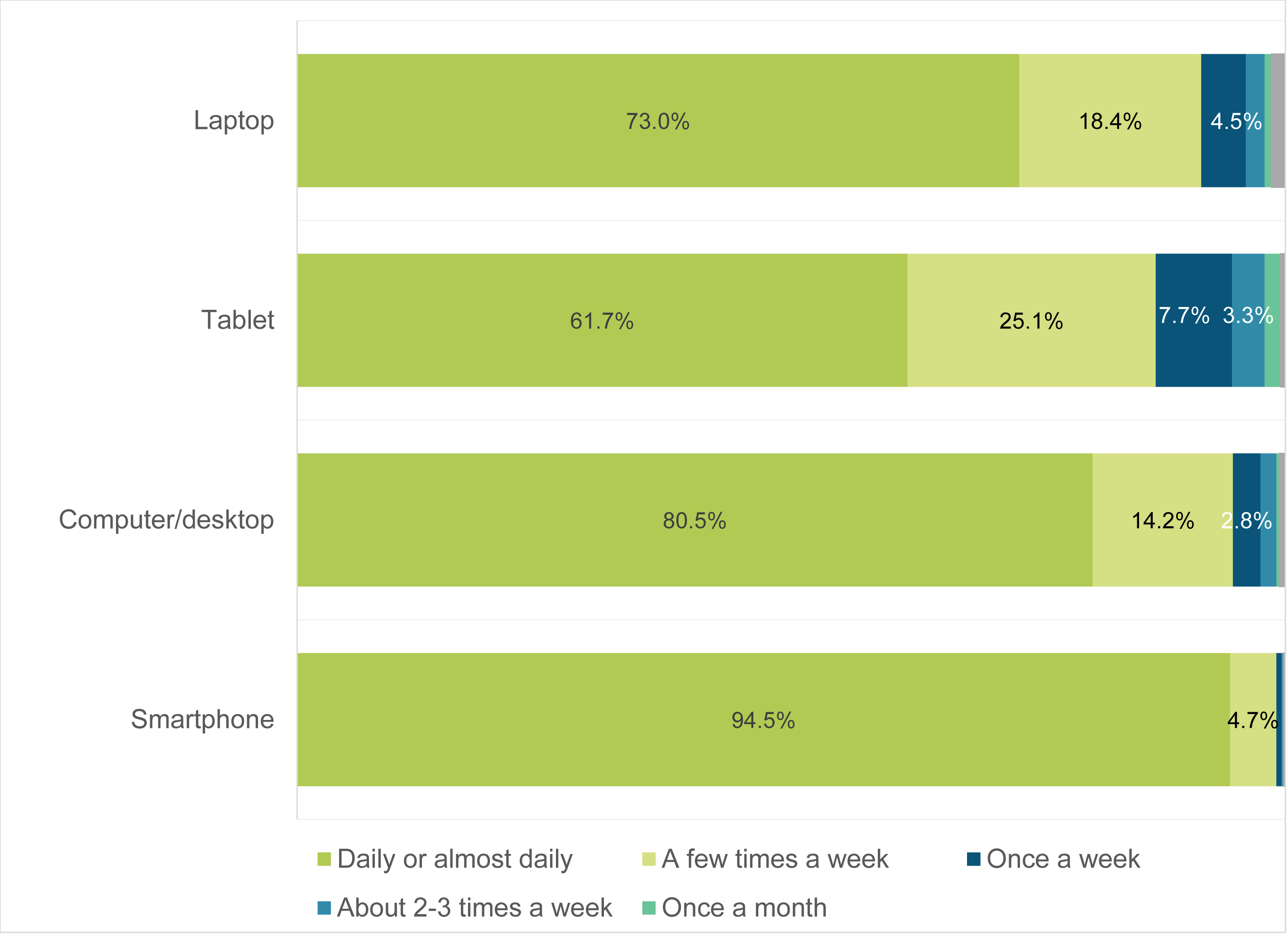 Considerate extensii ale noastre, smartphone-urile sunt primele device-uri folosite pentru accessul online de către majoritatea respondenților (87.6%). Pentru studiu, un criteriu mandatoriu a fost ca participanții să petreacă zilnic timp în online, indiferent de device-ul de pe care o fac.