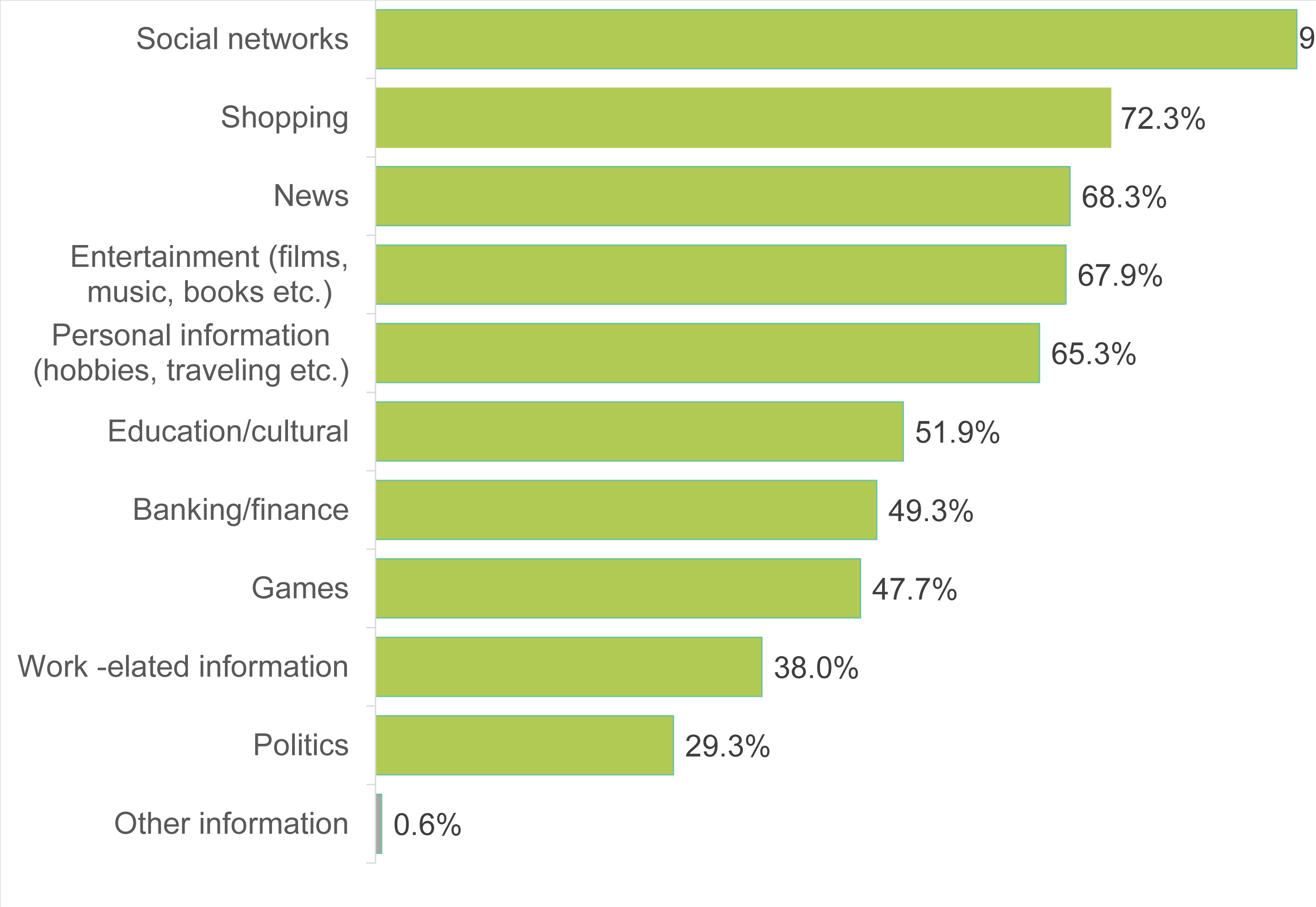 Masele nu prezintă un tip de utilizare sofisticată a digitalului, primele 5 genuri de content accesate pe internet fiind: rețelele sociale (90.6%), cumpărături (72.3%), știri (68.3%), divertisment (67.9%) și informații personale, precum hobby-urile (65.3%). Dimensiunile ecranului joacă un rol important în încadrarea conținutul, iar aplicații ca WhatsApp și Instagram sunt cel mai des accesate de pe telefon și alte dispozitive, în timp ce YouTube și Skype sunt mai potrivite pentru desktop/laptop.