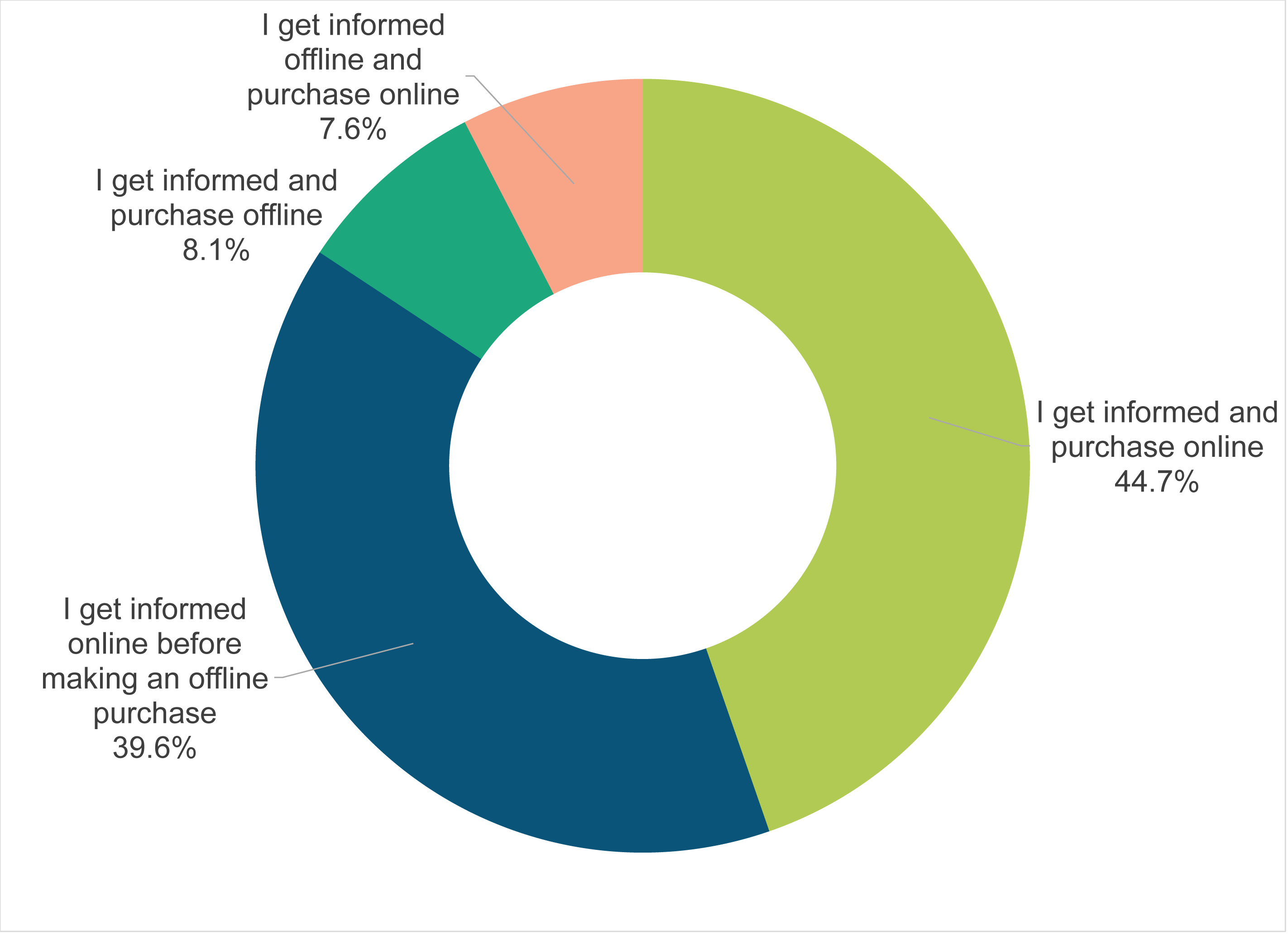 Când vine vorba de decizia de cumpărare, cei mai mulți respondenți digitali preferă să se informeze online, indiferent dacă achiziția rămâne făcută în online (44.7%) sau se mută în offline (39.6%). Persuasiunea offline și-a pierdut din relevanță, ceea ce înseamnă o putere mai mică de cumpărare offline.