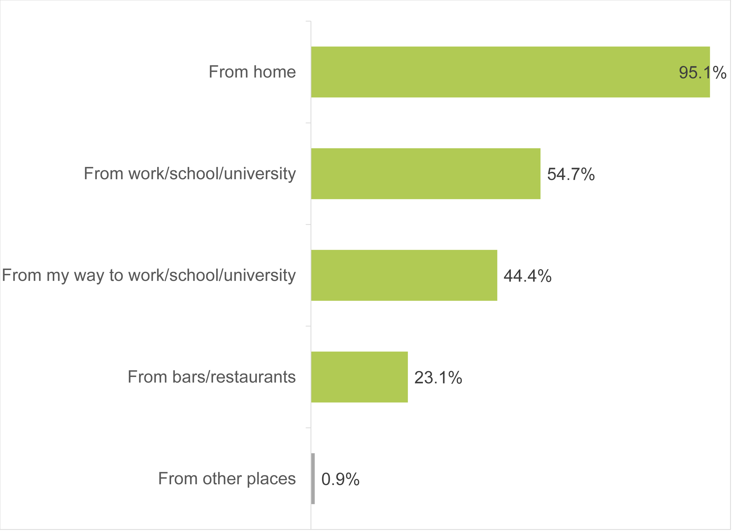 Majoritatea respondenților (98.4%) accesează internetul zilnic, în cele mai multe cazuri pe parcursul zilei (72.7%). La întrebarea de unde navighează online de obicei, 95.1% au ales ales confortul casei ca locație primară. Deși intuiția noastră ne spune contrariul, mai puțin de un sfert (23.1%) spun că intră online în timp ce se află într-un restaurant, bar, pub.
