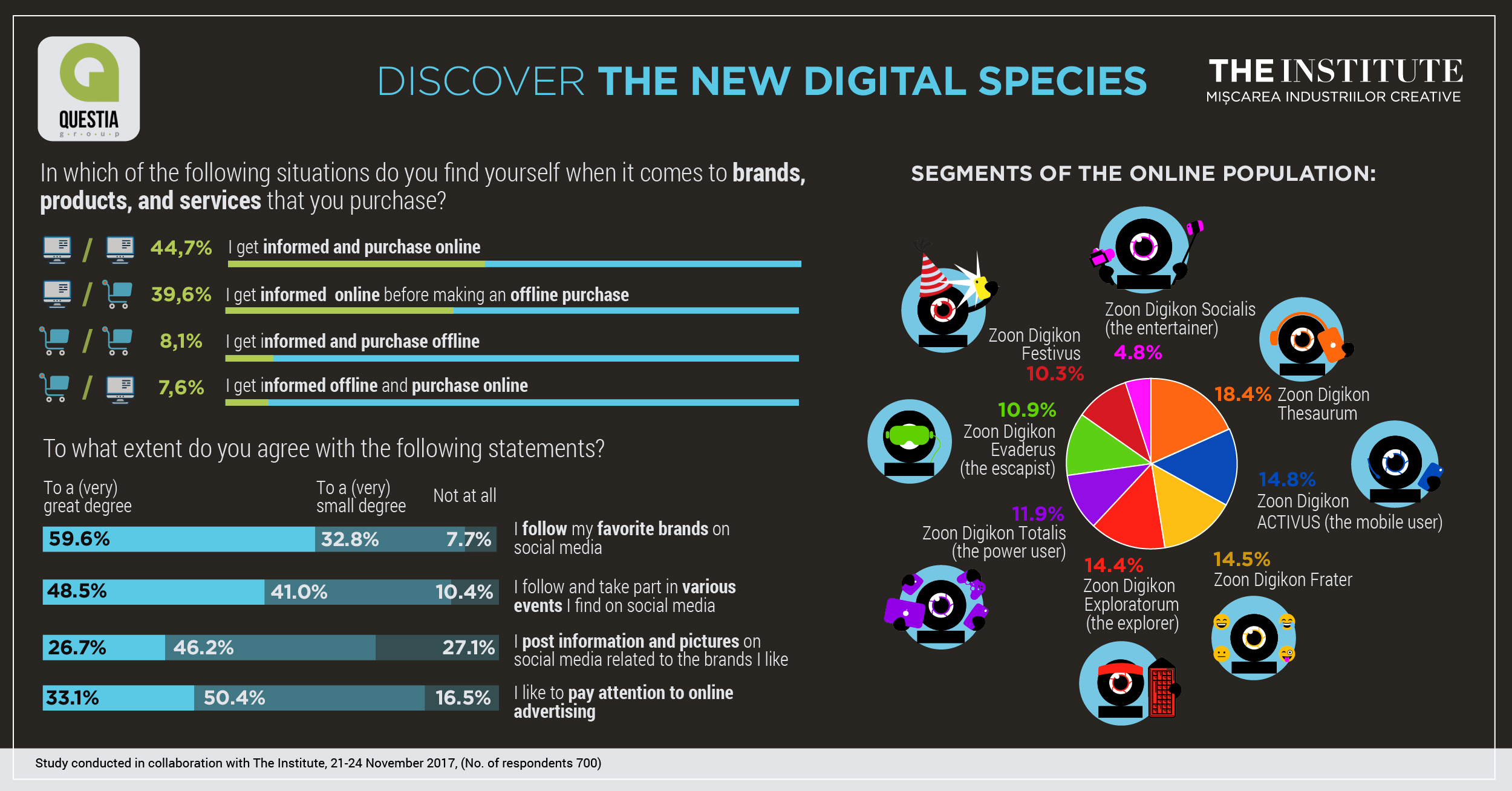 Questia, în colaborare cu The Institute, a condus o cercetare referitoare la tipurile de comportament ale utilizatorilor români în online, definind "speciile digitale". Sondajul a vizat 700 de persoane și a fost activ în perioada 20-24 noiembrie pe platforma Questia, având o marjă de eroare de +/- 3.7% raportat la populația din online a țării.