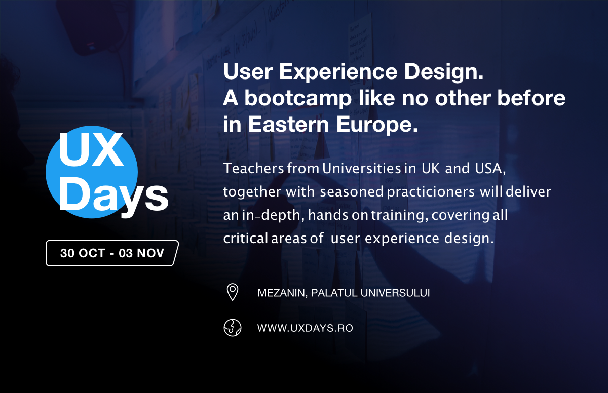 UX Days, primul bootcamp intensiv de User Experience din România, are loc în perioada 30 octombrie - 3 noiembrie la București. Construit după o curriculă special gândită pentru piața și industria din România, UX Days înseamnă 5 zile de cursuri intensive prin intermediul cărora participanții vor trece prin toate etapele procesului de User Experience Design, interacționând direct cu traineri de top, cu experiență vastă în User Experience Design.
