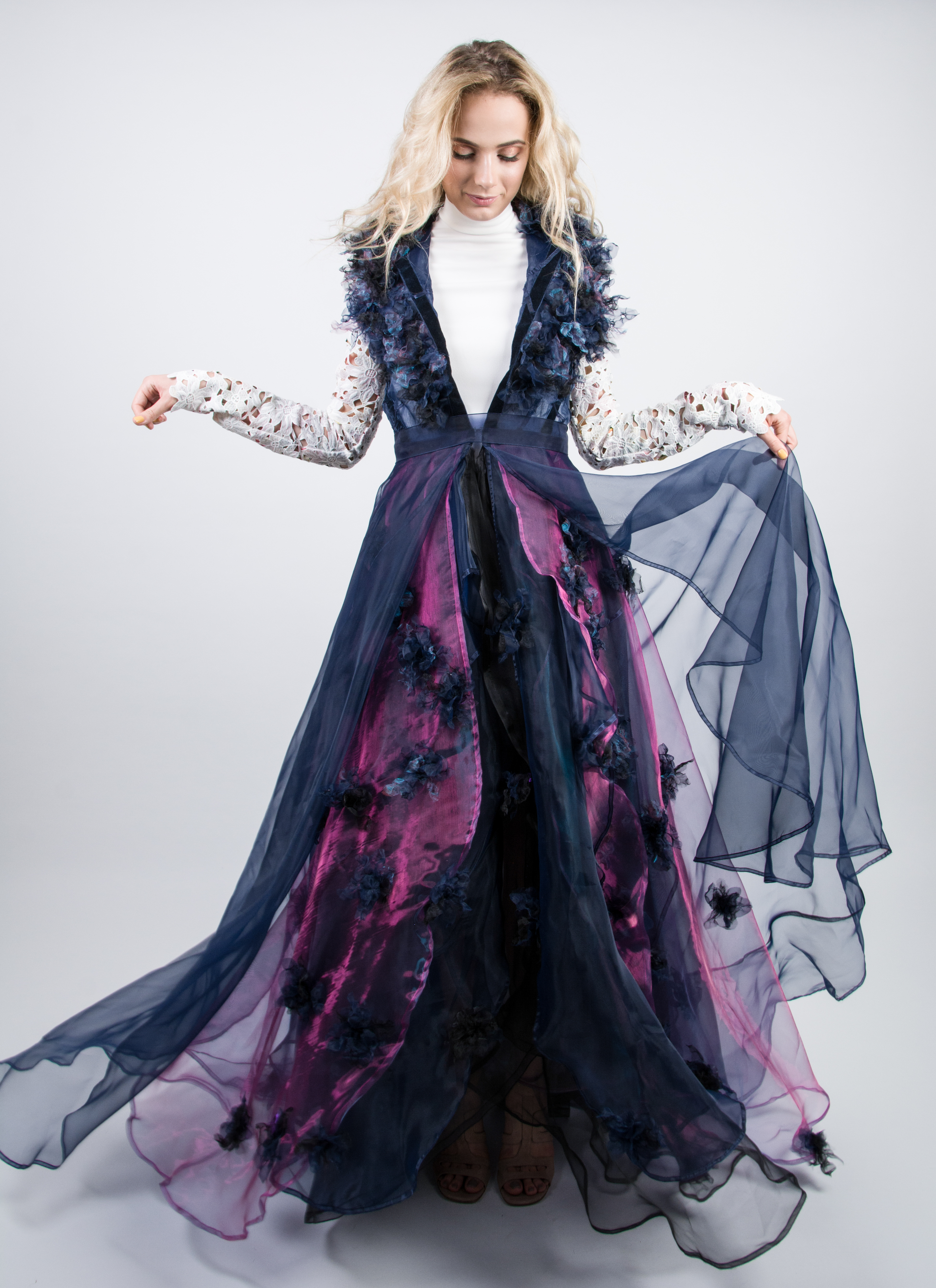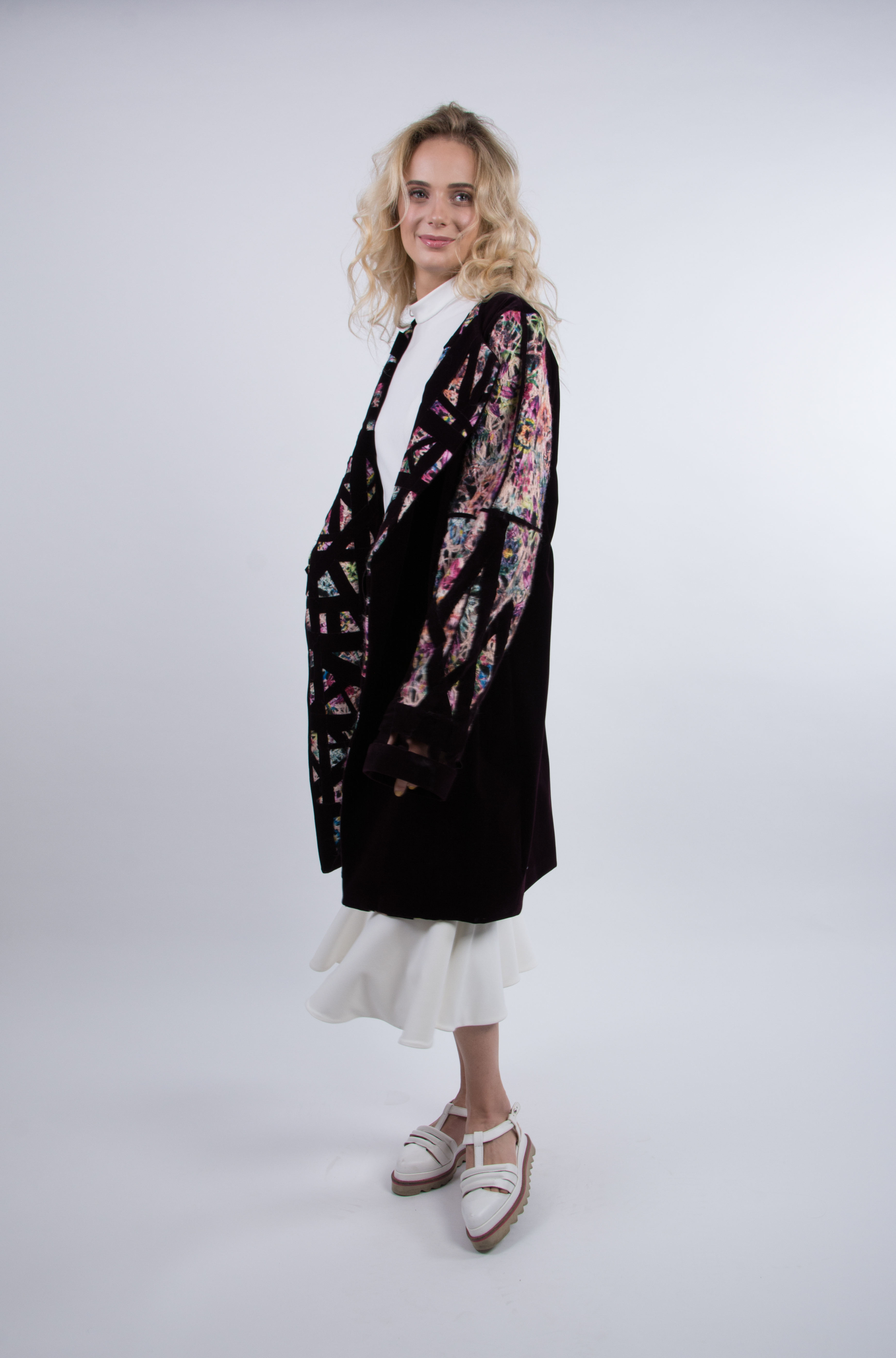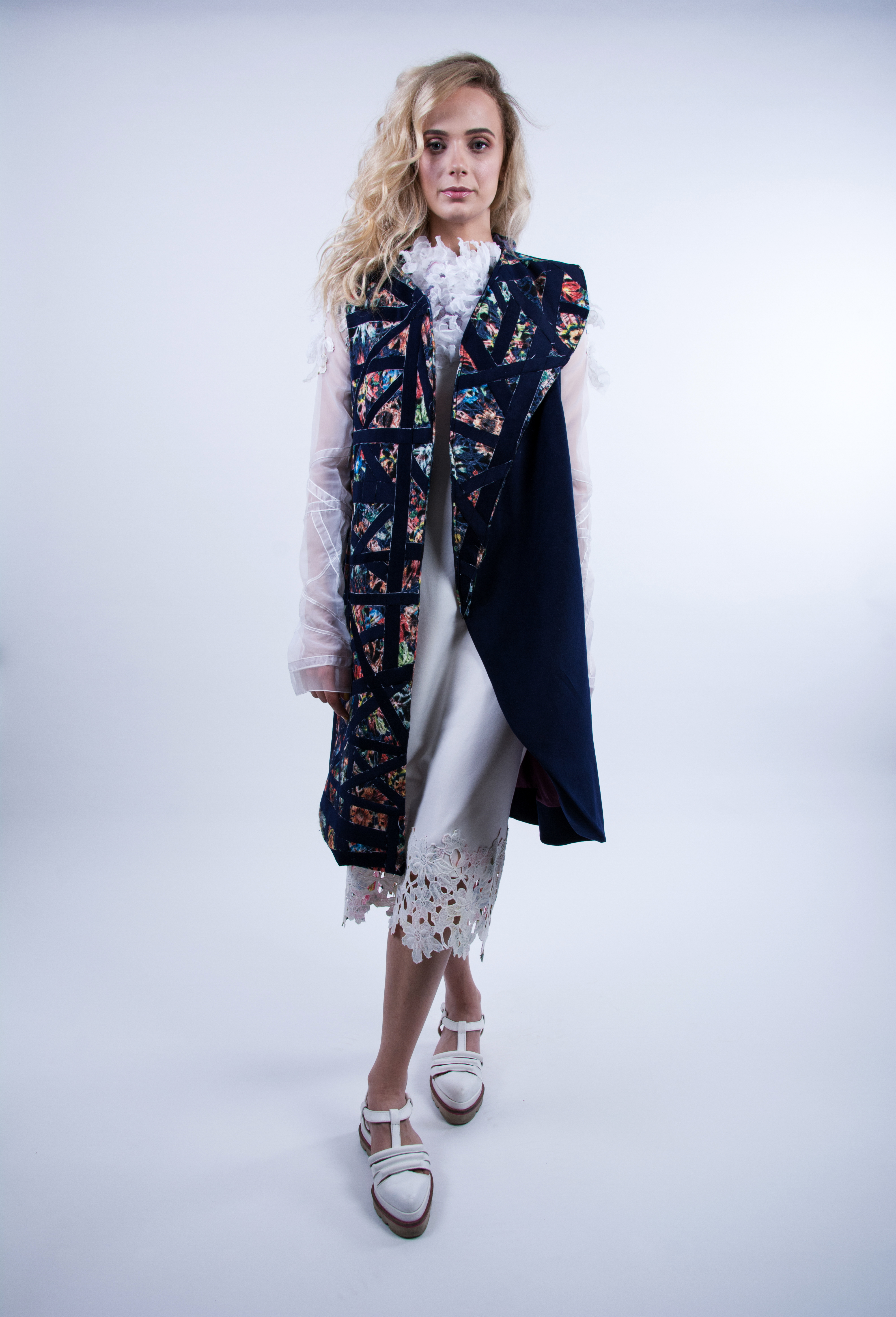 Prin juxtapunereade benzi cu materiale inflorate se evoca vizual structura clădirilor, a ferestrelor vitrate, iar textura obținută din prelucrarea materilelor transparente, brodată manual, amintește de exuberanța grădinilor inmiresmate.