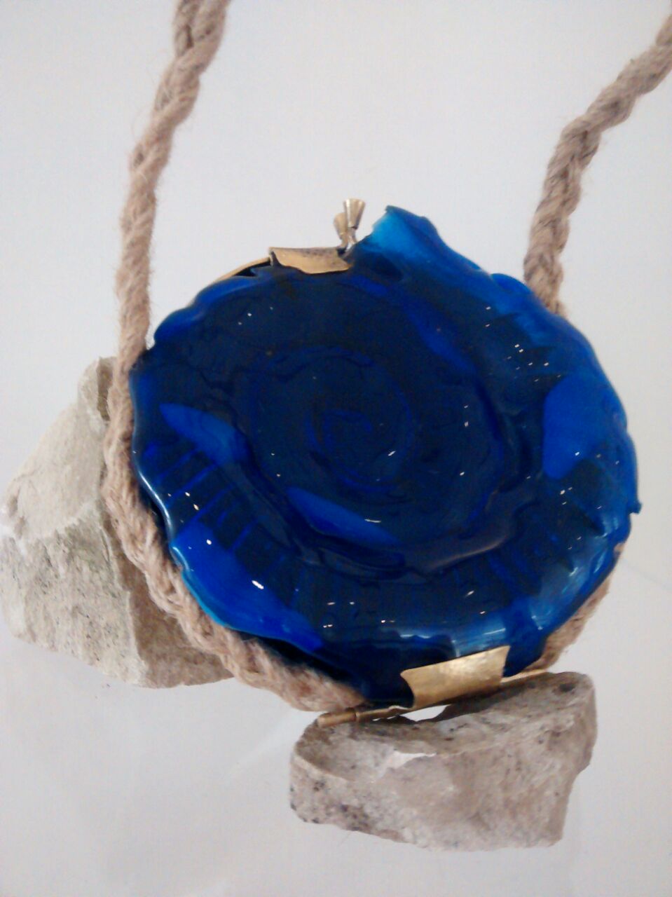 4. Design-ul Ready-Made vs. Antifashion.- “cutia”muzicală, geanta din sticlă fuzionată și alamă,colier ciment.