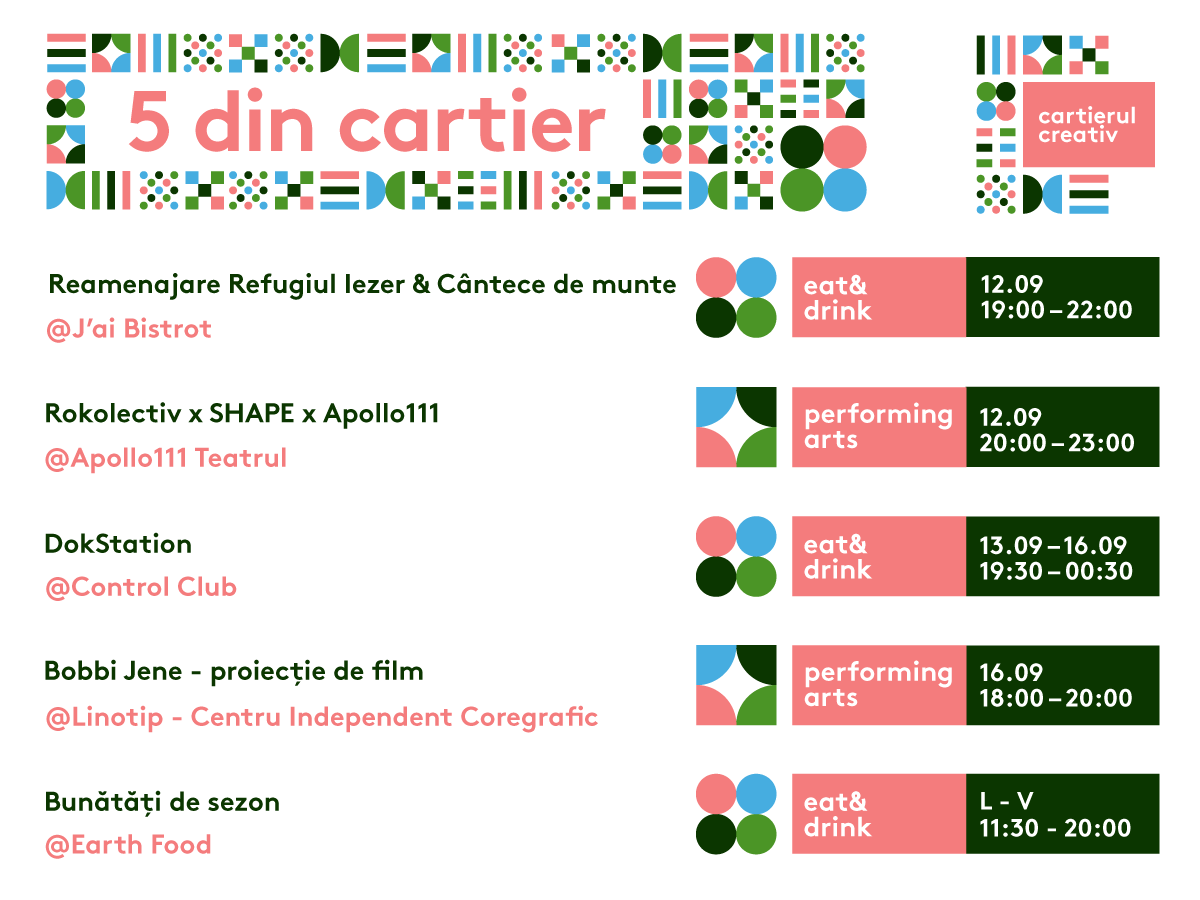 O nouă săptămână vine cu noi recomandări de evenimente de neratat în Cartierul Creativ. Pe agenda noastră de 5 din cartier din săptămâna 10-16 septembrie: