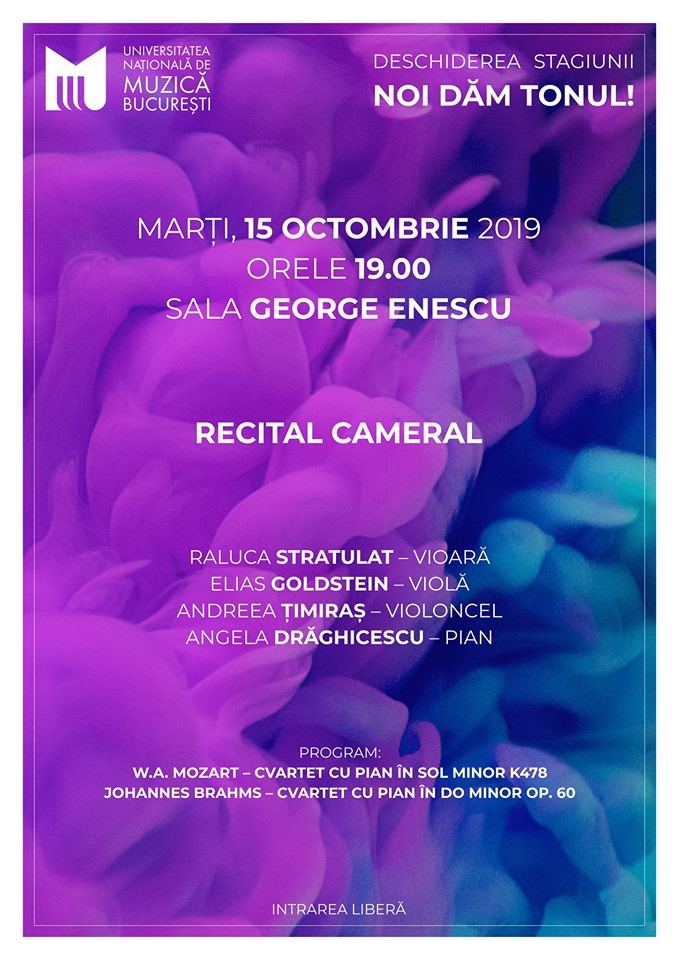 Universitatea Națională de Muzică București vă invită la un recital cameral susținut de Raluca Stratulat – vioară -, Elias Goldstein -violă-, Andreea Timiraș-violoncel- și Angela Drăghicescu -pian.