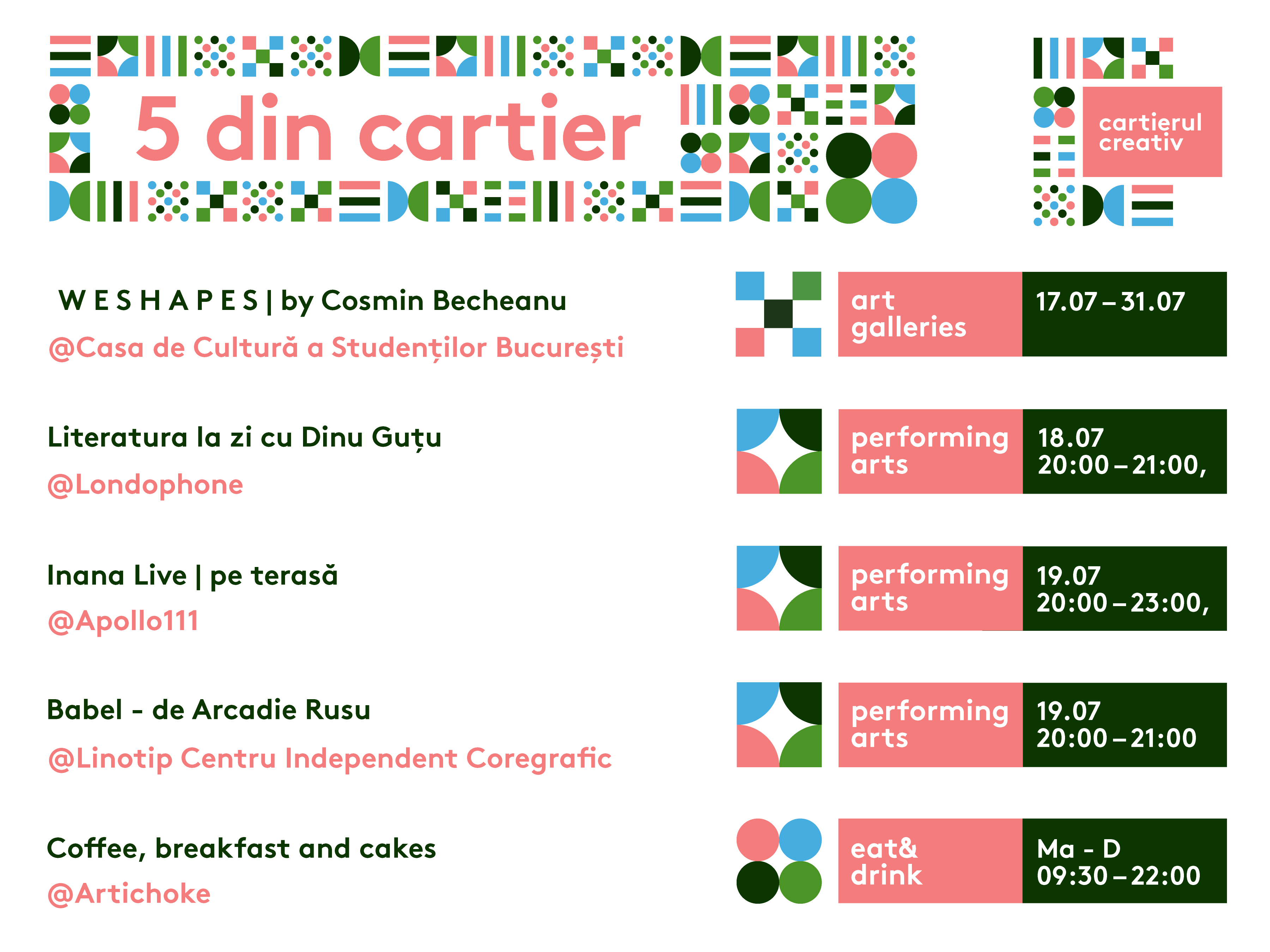 Săptămâna aceasta dansăm, citim, admirăm și bem cafea bună în Cartierul Creativ. Iată recomandările „5 din cartier” pentru săptămâna 16-22 iulie.
