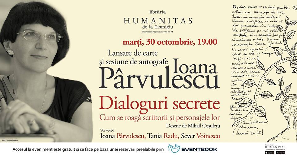 Editura Humanitas Cișmigiu găzduiește marți, 30 octombrie, de la 19.00, lansarea volumului “Dialoguri secrete. Cum se roagă scriitorii și personajele lor” de Ioana Pârvulescu, cu ilustrații de Mihail Coșulețu. La eveniment vor vorbi alături de scriitoarea Ioana Pârvulescu, criticul literar Tania Radu și jurnalistul Sever Voinescu, redactor-șef Dilema Veche.