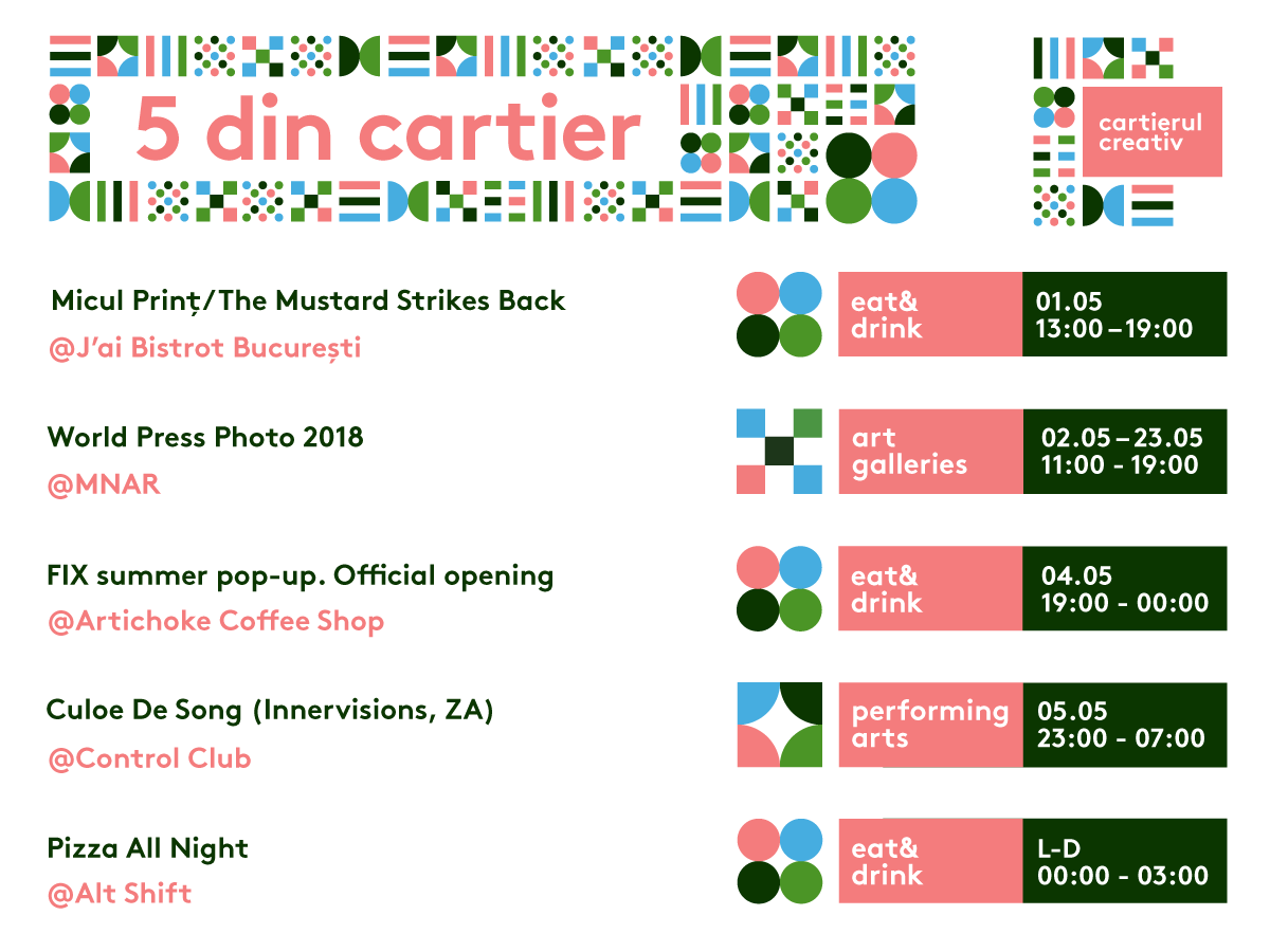 Tradiționalul grătar de 1 mai, fotografii de presă care fac înconjurul lumii, băuturi speciale de vară acum și pe terasă, la umbră, pizza după miezul nopții și muzică cu beat-uri din țări îndepărtate avem săptămâna aceasta în rubrica recomandărilor „5 din cartier”.