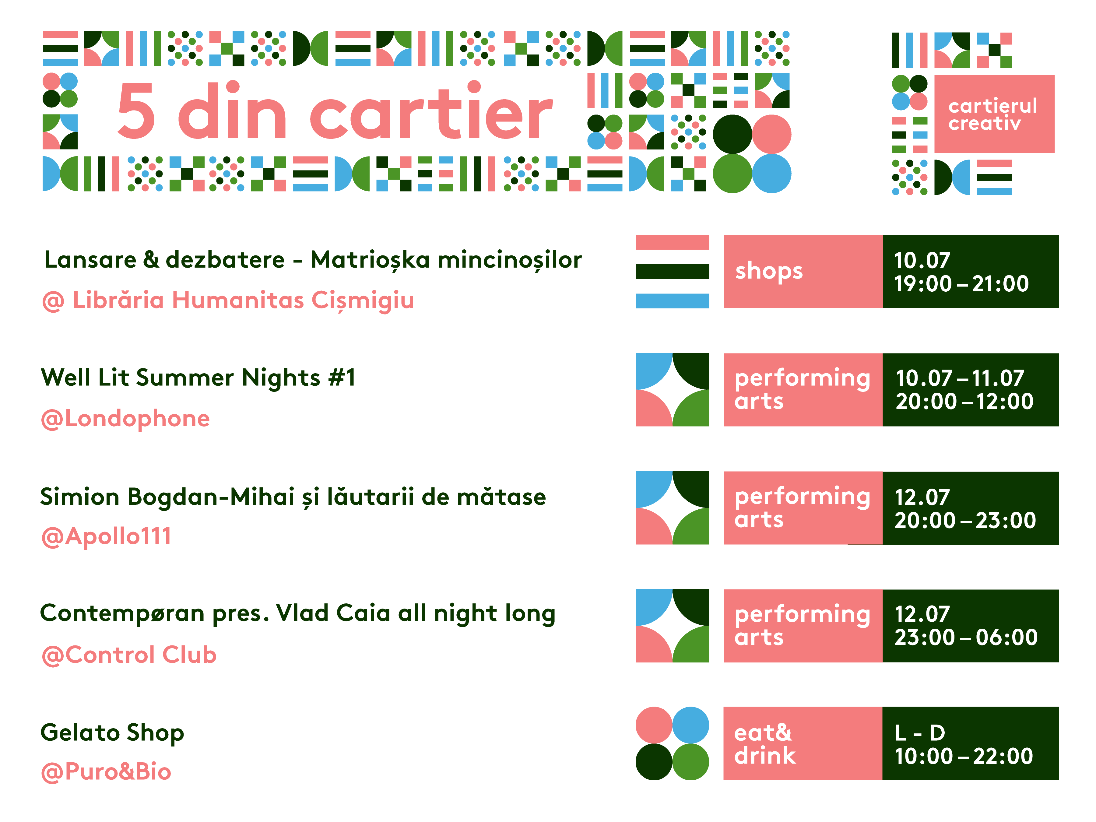 Lunea vă punem la curent cu recomandările noastre pentru întreaga săptămână. Iată rubrica „5 din cartier” sau ce nu trebuie să ratați în perioada 9- 15 iulie: