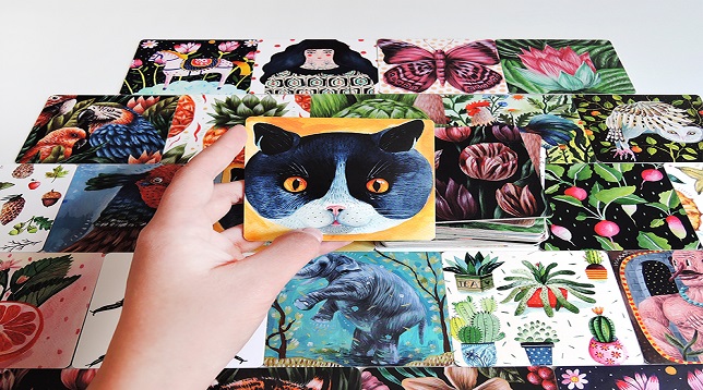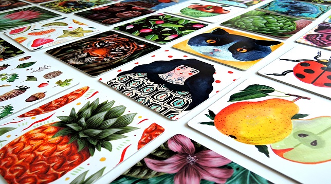 The set is a collaborative work between Aitch and Saddo, it contains 48 cards with 24 unique hand-painted illustrations depicting flora and fauna, printed on pieces of thick cardboard, sized 9 cm x 9 cm.