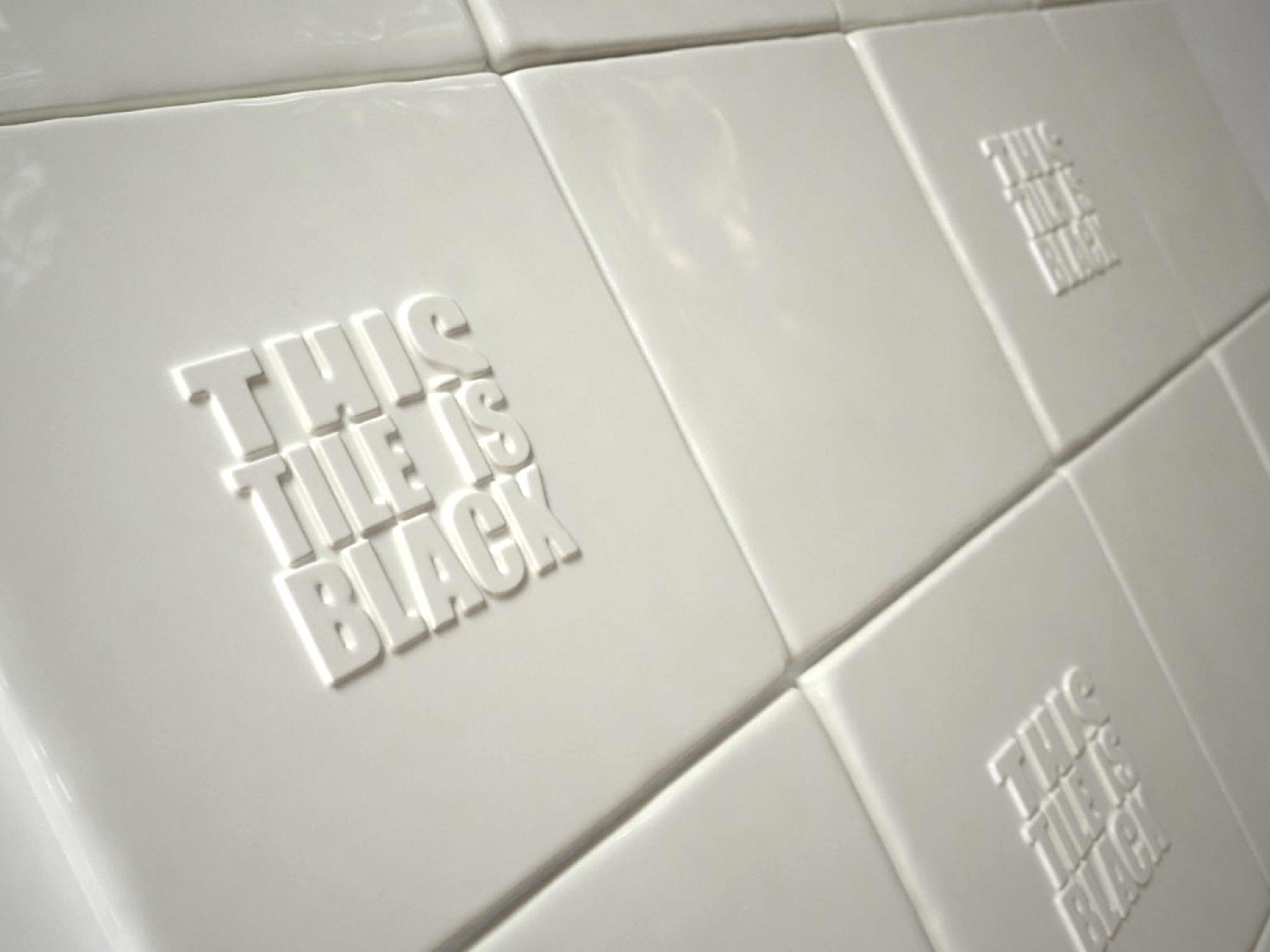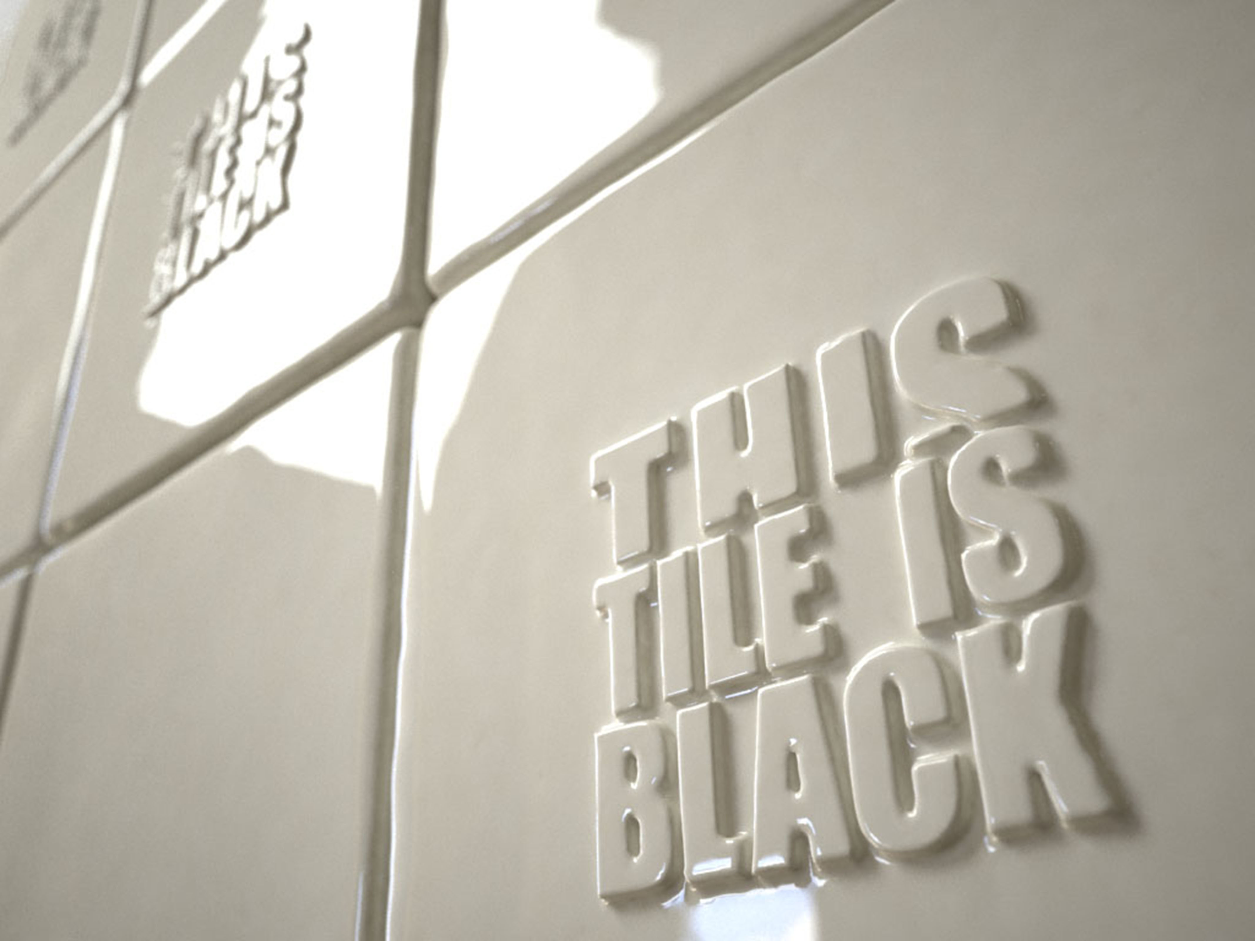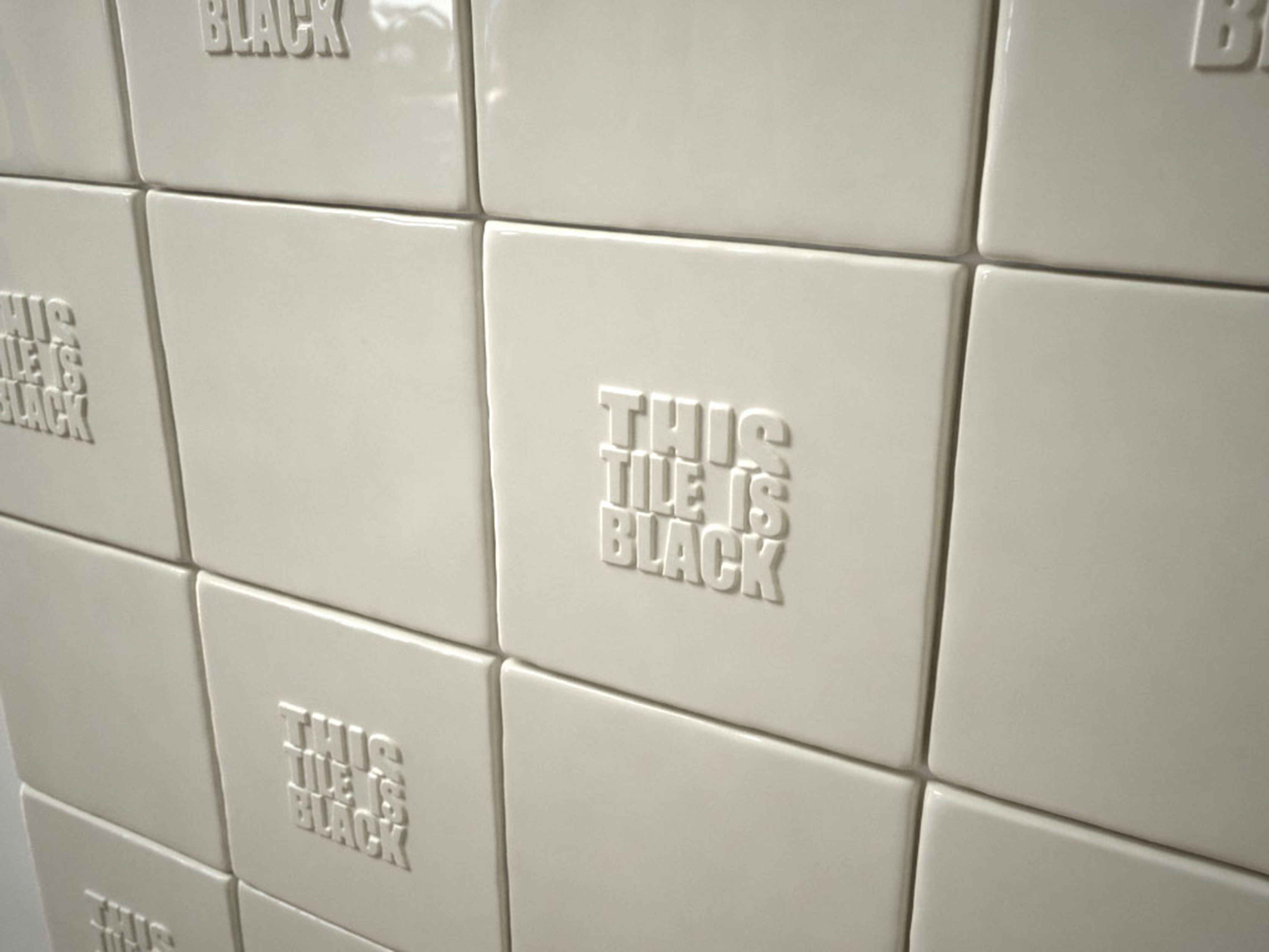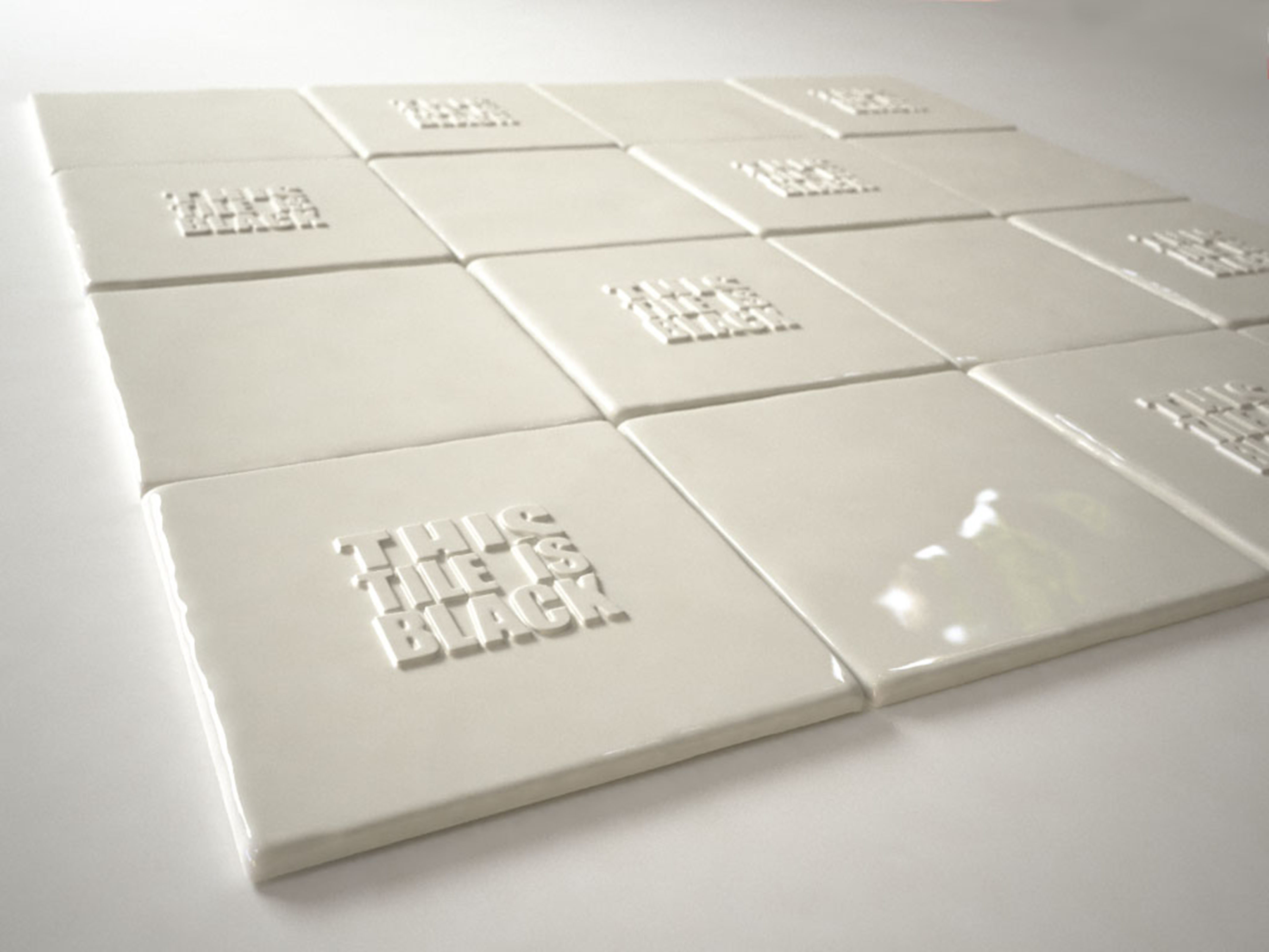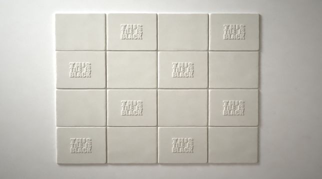 The Color of White is an image-and-text installation advanced with the medium of ceramics. It searches for a more profound understanding of the material. This new preoccupation of the artist for how the things are perceived developed from the simplest question: “What is white?” Using tiles made from recycled white clay, the classic checkered pattern and a substitute text, the work suggests realities that are hidden beneath the layer of immediate interpretation. It is known that in ceramics, in order to obtain some bright colors it is required to use high-risk substances. The artist declares as sufficient, creative and safe the alternative formula of inferring optical black only by reading its name. At the heart of this project is the determination to pursue a sustainable practice within this field and to speak of a way in which designers and ceramic creators could manage the materials, the techniques and the concepts as to develop objects that are not toxic to humans and nature.