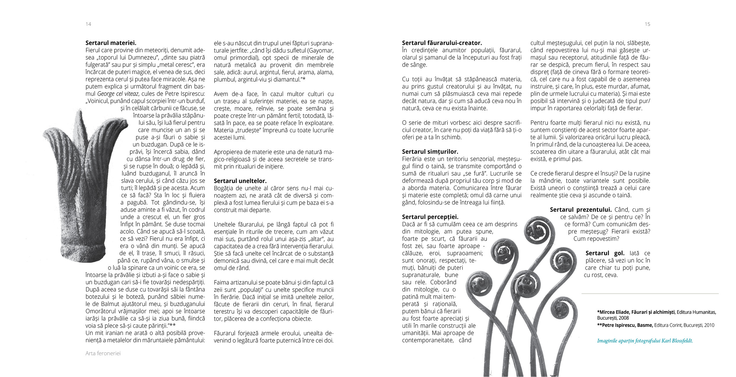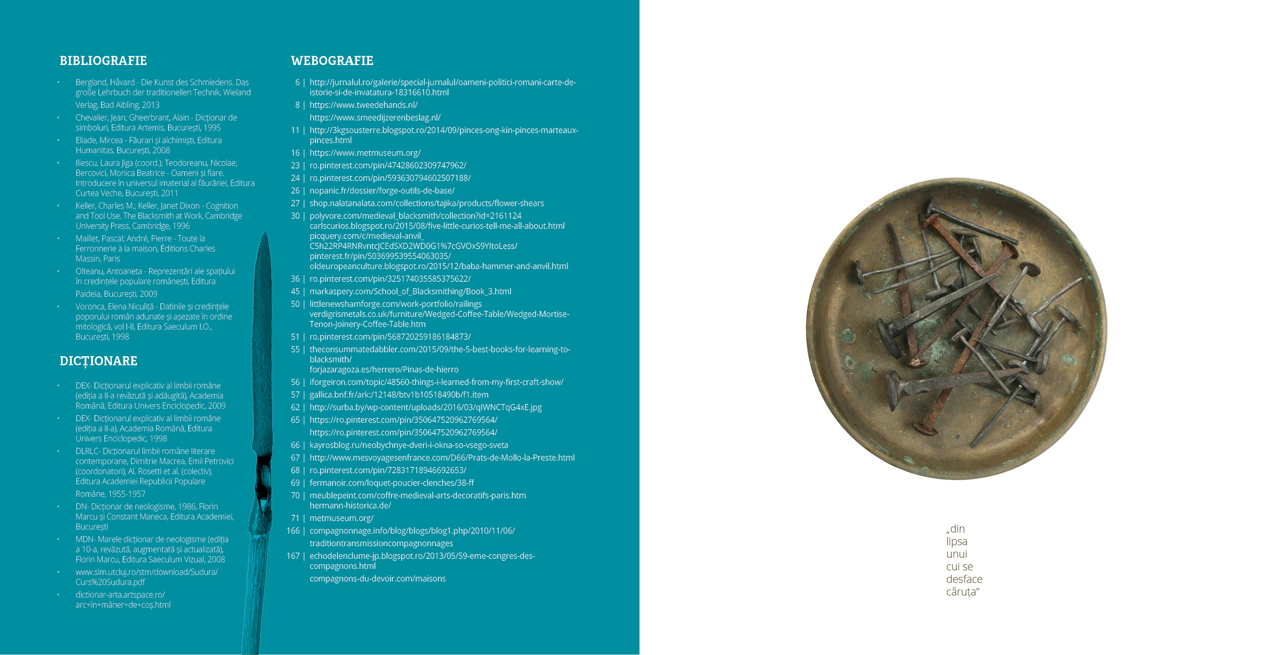 The Art of Blacksmithing is a book that honors the craft of iron working. The first part can be considered a blacksmith's handbook. Sylvain Gabriel, traveling calf, spends a year at „Batem fierul la conac!” working with children in the village and gathering in a course exercises and notions necessary for a first initiation in blacksmithing. Over time, the material is updated with the set of objects, activities and theoretical notions acquired between 2012 and 2017 under the footsteps of blacksmiths Leo Coutant, Sebastien Palomas, Fabien Monestier, Antoine Deroo and Pierre Hosta guided by architects Alexandra Mihăilciuc and Şerban Sturdza.