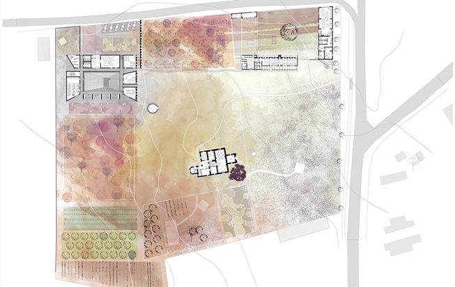 În cazul curților Brâncovenești tipice, grădinile sunt mai deschise sau mai retrase în funcție de destinația acestora. O astfel de curte prezintă cel puțin două zone importante delimitate prin intermediul unui zid: o zonă destinată anexelor și una ce include conacul și o parte din grădină. Proiectul reinterpretează ideea separării spațiilor folosind diferite elemente pentru a obține un efect similar: diferențe de nivel, prezența vegetației sau folosirea limitelor transparente pentru a defini diversele spații. Vegetația a fost preferată zidului întrucât reprezintă un element natural ce permite o percepție mai fluidă și unitară a incintei.