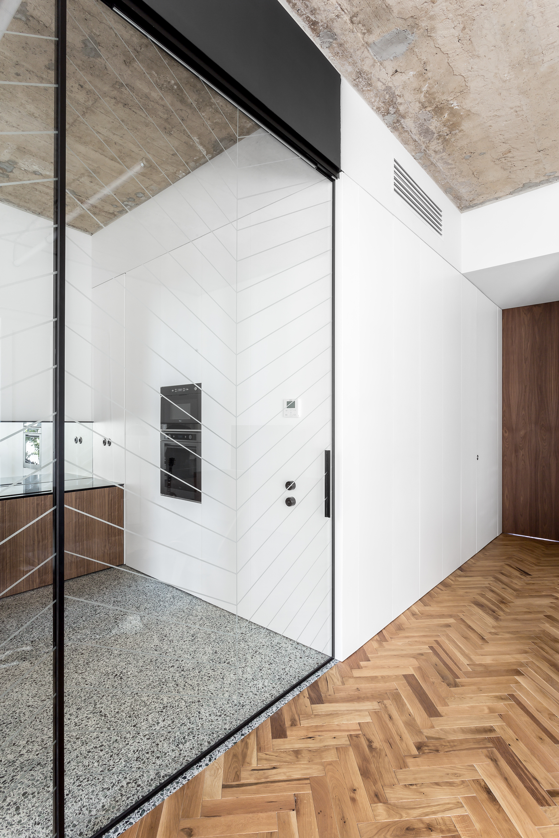 A custom made sliding glass door, inspired by the design of the original wooden doors, separates the living room and the kitchen.