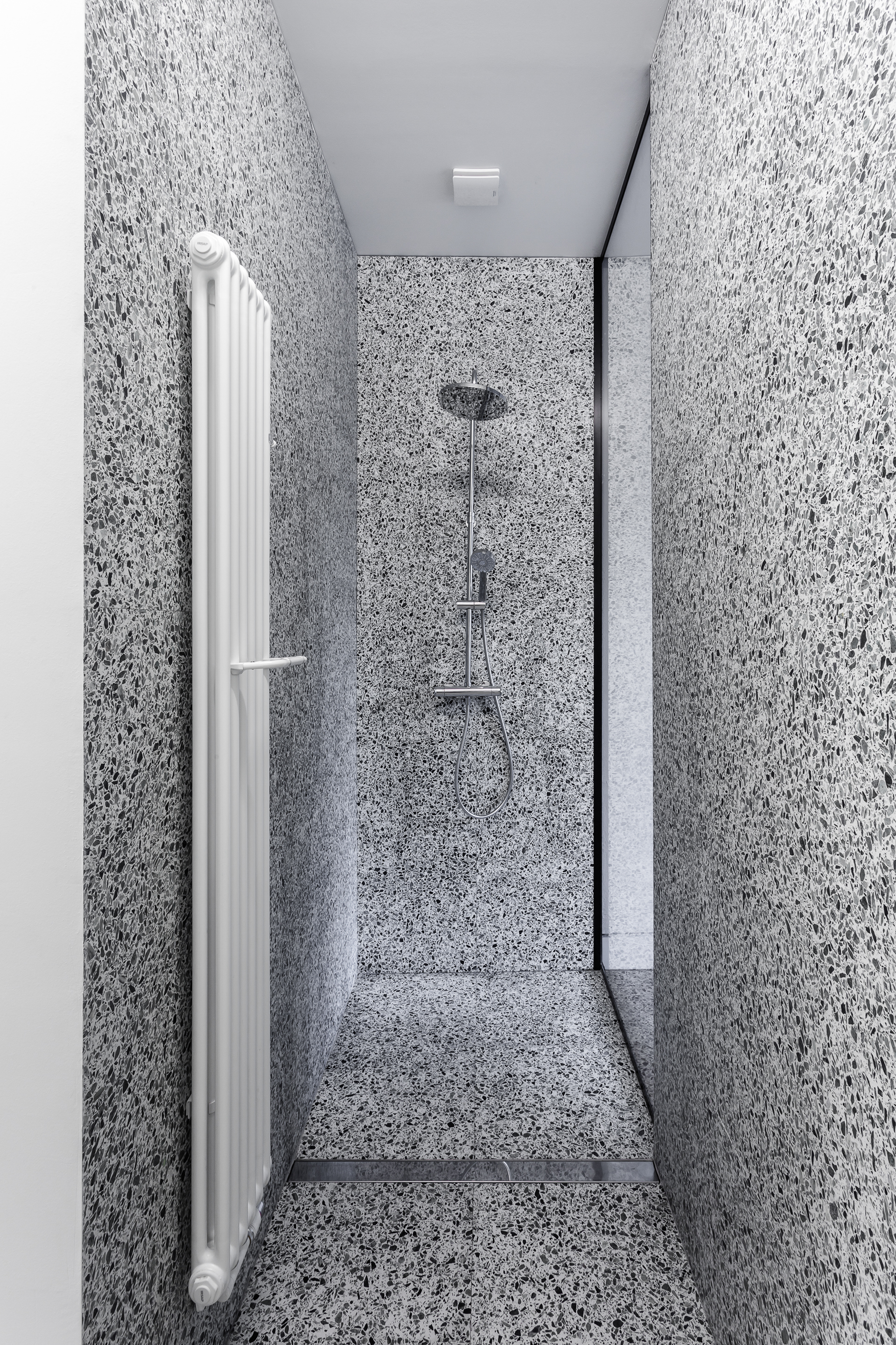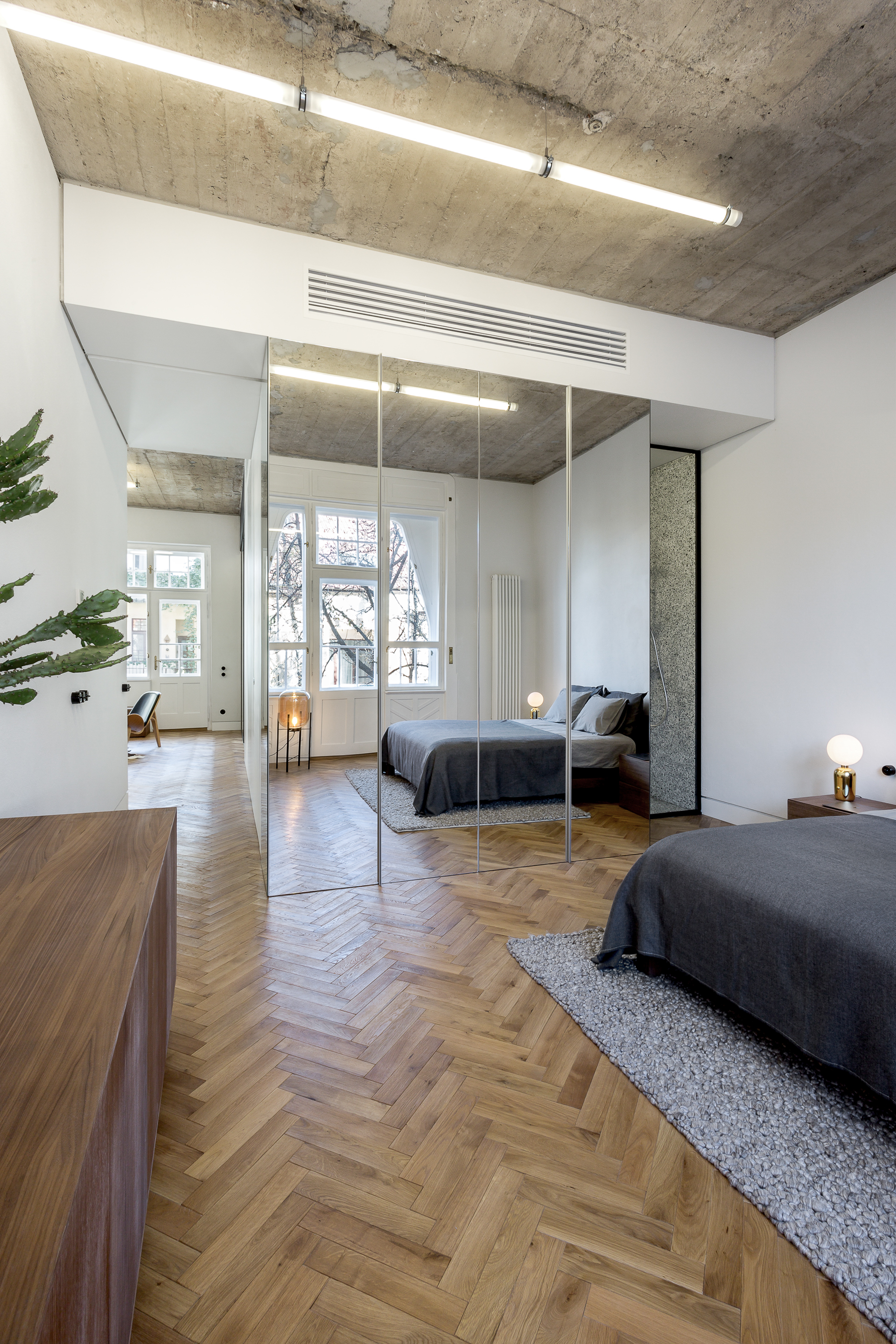 The main functions are placed around the new central volume witch hosts the bathroom and all required storage spaces, marked by a narrow shadow gap.