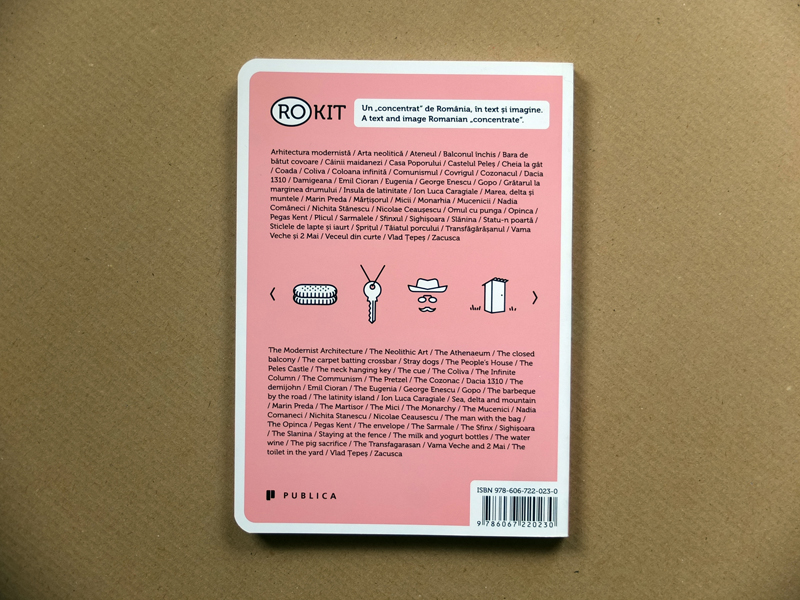 RO‑KIT is inspired by a similar project, “idarg”, discovered by Alexe Popescu in Buenos Aires, in 2009. Both try to present a country’s specifics using minimal expression means. Moreover, RO‑KIT is the result of the encounter of two people who felt equally challenged by the idea of realizing a “concentrate” of Romania, from a personal perspective. The choice of 50 identity elements is one of the self imposed limitations. Too few to cover the Romanian whole, but a sufficient number to offer a representative image of the country. The graphical challenge was finding expressive but geometrical solutions for each symbol, using a single line thickness. The literary challenge was approaching the subjects in a concise manner. The 50 components of the “kit” could be, for Romanians and foreigners, construction elements in assembling their own image of Romania.