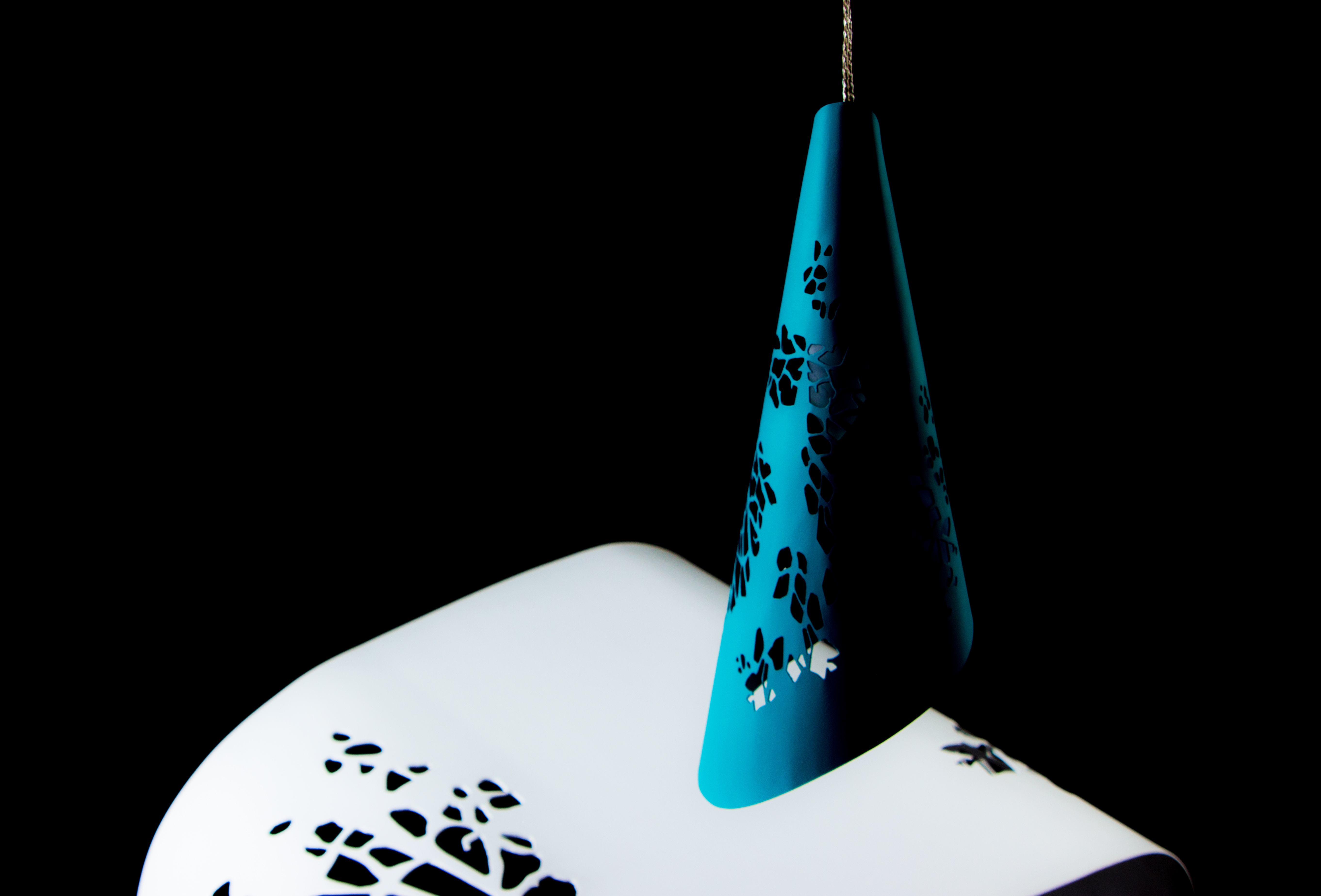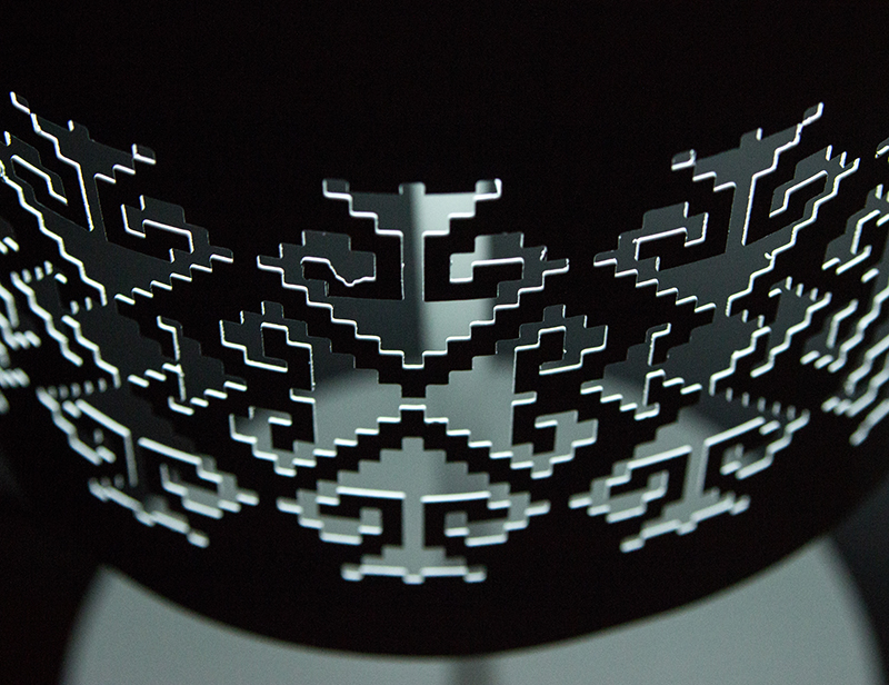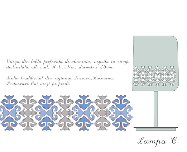 The Romanian Lamps are a series of lighting fixtures with perforated motifs of traditional Romanian inspiration. Keeping the same theme of metal decoupage, they are made of thin and light aluminum sheets combined with heavier bases made of steel. The intent was to create a series of oversize floor lamps that depict traditional elements and contribute to the general ambiance by the variety of shadows they cast.