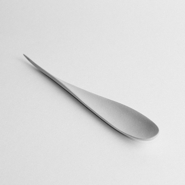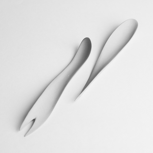 "We make friends around the dinner table. We also get to know each other, share and savour together the entire dining experience, and the instruments that are meant to help us do that come to complete and better the whole experience." The project combines the elegance of organic forms together with ergonomically coordinates and multifunctionality in order to create cutlery that contributes to that whole dining experience. The designer combined the usual dining tools, reducing them to just two objects: soup spoon + knife, dessert spoon + fork. The two utensils change their purpose according to the way they are manipulated and the 90 degrees twist enables you to make better use of them.