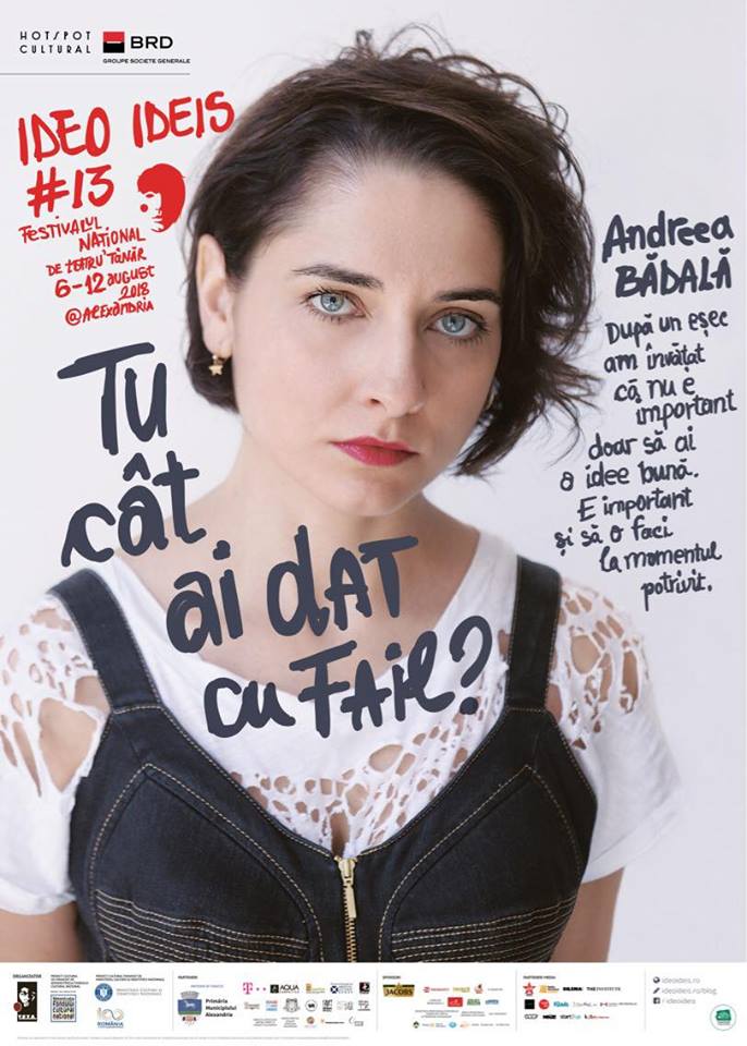 IDEO IDEIS #13 se desfășoară între 06 și 12 august la Alexandria, sub sloganul „Tu cât ai dat cu fail?”. Tema de anul acesta îți propune o schimbare de perspectivă asupra eșecului: o nereușită profesională sau personală este o șansă să te cunoști mai bine, să evoluezi în carieră și chiar să devii un om mai bun. Amalia Enache, Ana Ularu, Deliric, Andreea Bădală și Radu Jude s-au implicat în campanie și și-au asumat public un eșec personal, pentru a le transmite liceenilor un mesaj important despre ce înseamnă perseverența.
