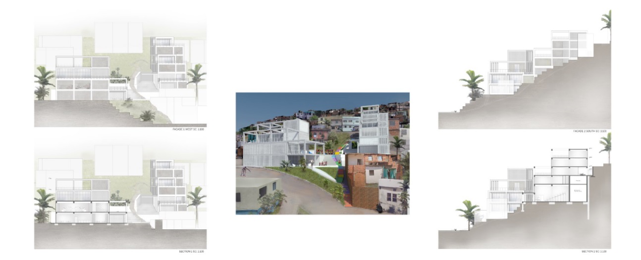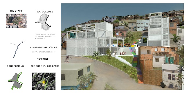 Datorită lipsei de spaţiu public în favelă, intersecţia scărilor ce conectează cele două clădiri care oferă spaţii de dans, muzică şi activităţi de educare, devine nucleul proiectului şi se dezvoltă într-un spatiu public.