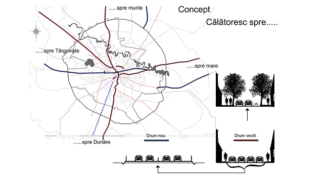 Proiectul tratează destructurarea actuală a intrărilor în București, atât din punct de vedere spațial cât și din punct a imaginii urbane. Analizele conduse de la nivelul metropolitan la cel urban și local evidențiază potențialul de dezvoltare și reconfigurare a vechilor intrări în oraș în contextul dezvoltării rețelei de autostrăzi. Intevențiile propuse de-a lungul a patru axe de intrare în oraș pleacă atât de la elementele specifice fiecărui sit în parte cât și de la o serie de concepte teoretice. Conceptul general al intervenției este declinat în cadrul fiecărui proiect în parte în funcție de logica teritorială a siturilor abordate.