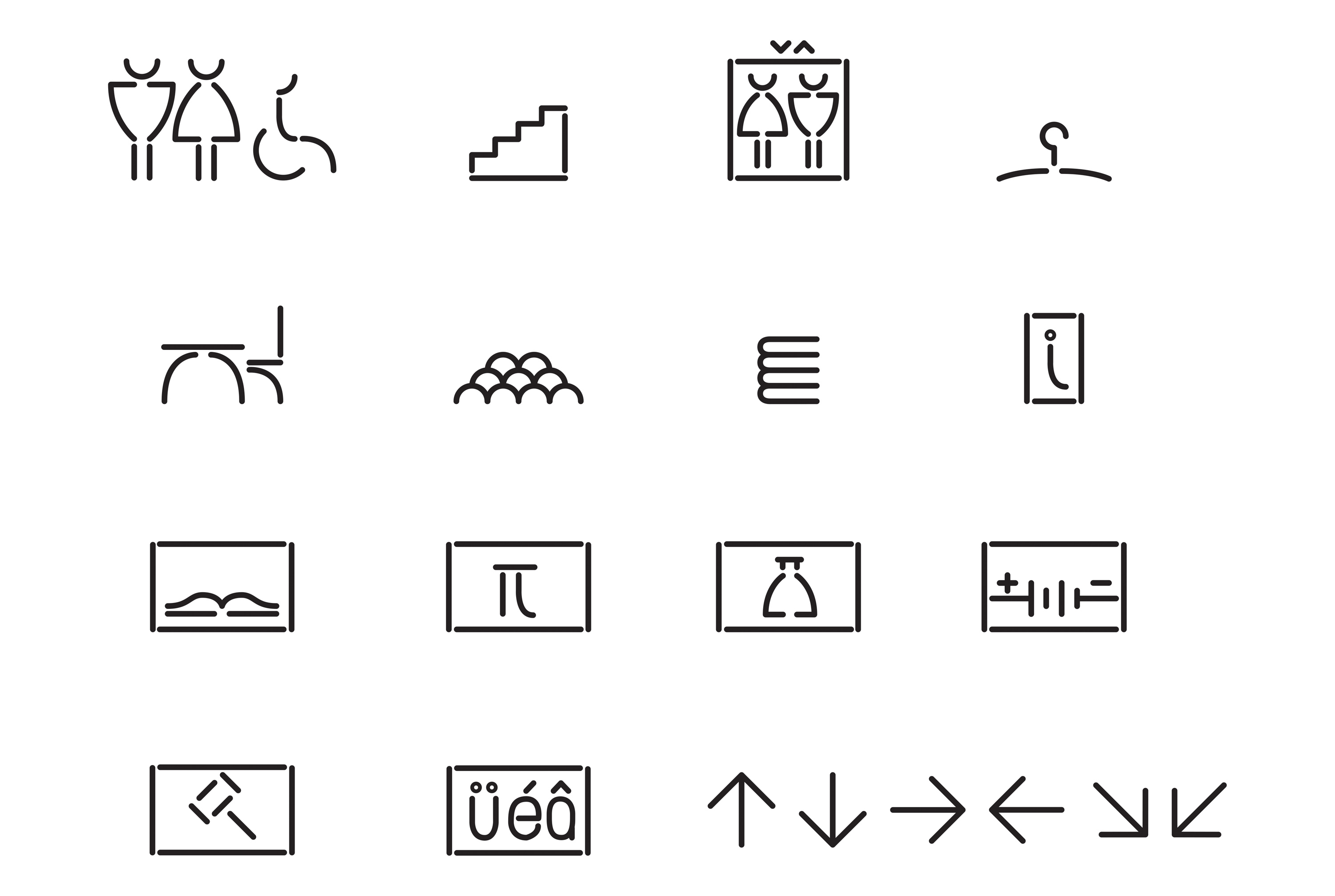 The National Library is the largest library in Romania. In 2009 the rehabilitation work started and in 2012 the cultural space had been opened for public. She started working at this project in october, 2013. But before this, she had two mounths for documenting the space, its new architecture, light and surroundings. structuralism, geometry, volumetry. The interior is a combination of lots of materials, textures, surfaces. So she started with all these in mind, and developed a system based on a basic metric grid, with liniar shapes but with round terminations, like a skelet. Many shapes are taken from the duepuntozero type features, and adapted on the metric grid. There is an interesting play between type and icon. A specific place is written in 3 languages dinamic and flexible way. Both elements (type and icons) use the duepuntozero font, icons being seen here like dingbats from this font. Moreover, the interior architecture is divided in two: dark spaces and bright spaces, which made her develop two types of mapping the icons: in the bright spaces she used neutral black self-adhesive for a higher contrast (low cost is very important here, to make room for a bit more expensive mapping for the dark spaces), and in the dark spaces she used neon tubes to enlighten the way to a specific room, a white light which is the reversed of the bright space.