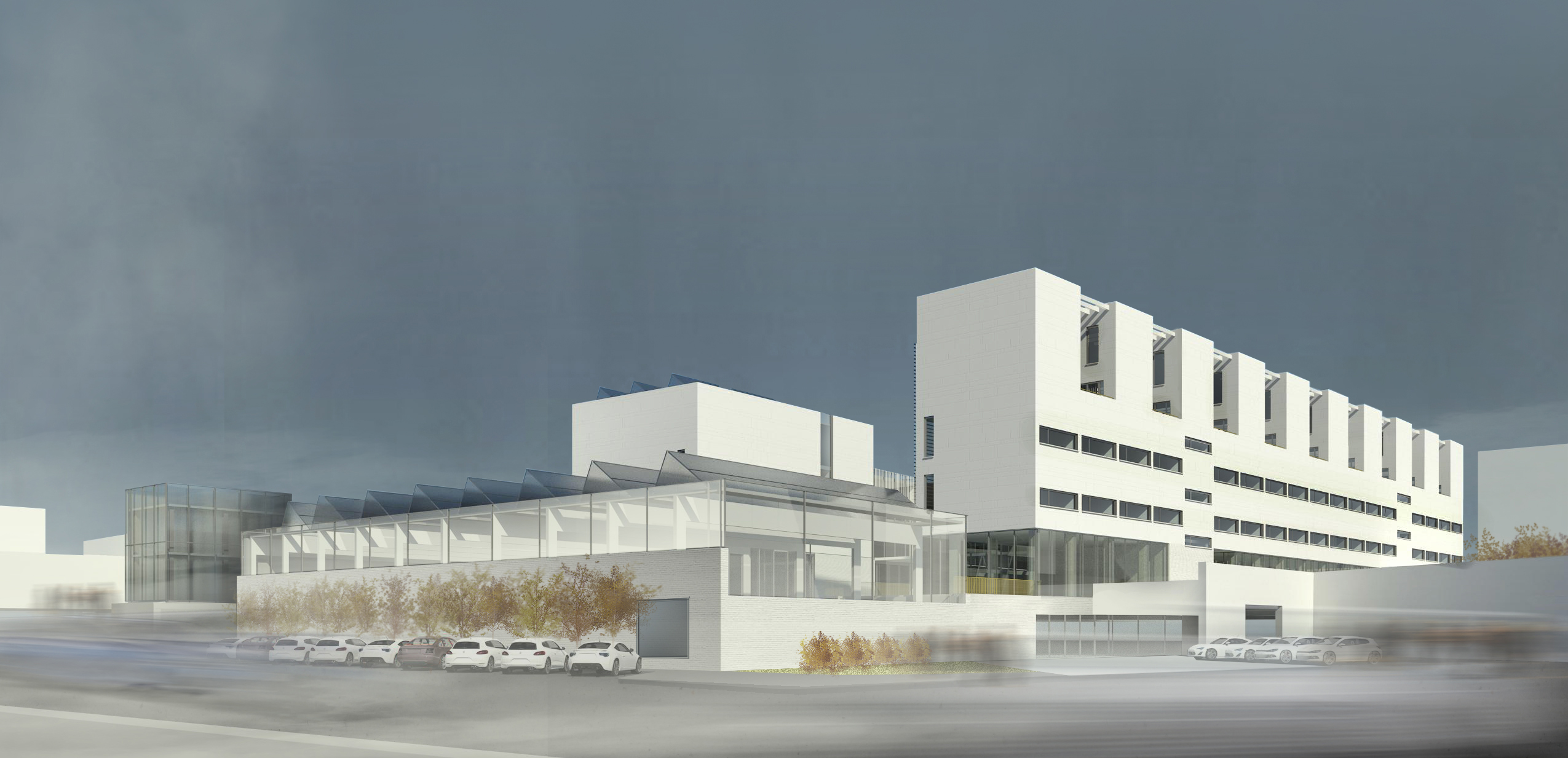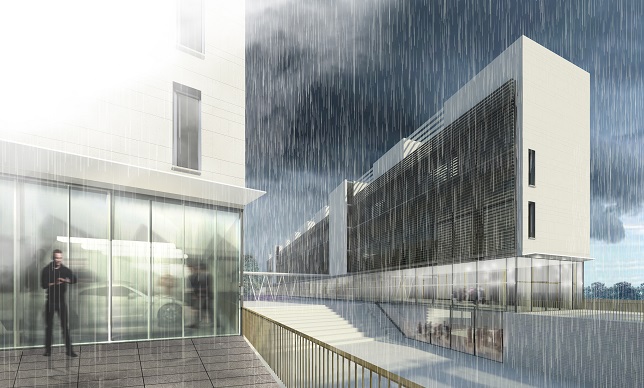 Caracterul terenului, orientarea față de punctele cardinale și relațiile care se stabilesc, au determinat o desfășurare de tip incintă, având ca elemente definitorii școala și cazarea. Școala susține prin paralelism direcția arterei principale din zona, artera cunoscută pentru comerțul cu piese auto și ateliere și devine fundal pentru o serie de astfel de spații, regândite o dată cu noua intervenție. Astfel, spațiile de învățământ sunt orientate spre nord, pentru o iluminare propice. Bara de cazare, așezată în unghi față de școală face compoziția să se deschidă spre zona de acces, maximizând spațiul curții interioare. Astfel poziționate, spațiile de cazare sunt orientate spre est, având deschidere spre râul Argeș și mai departe spre zona de dealuri.