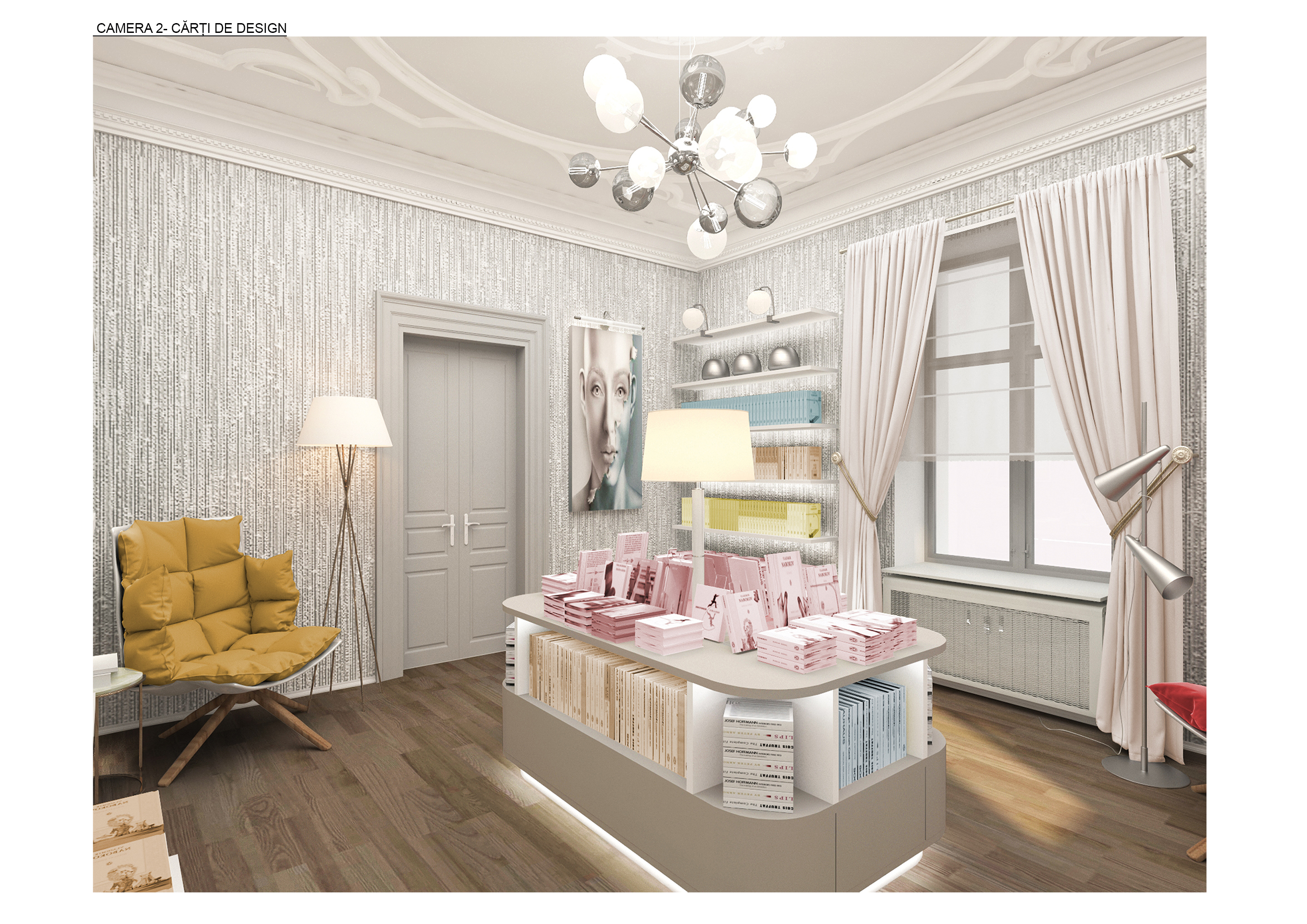 Conceptul de ‘’Gradină de carți’’ a aparut în urma dorinței de a aduce elemente din natura la interior pentru a inlătura bariera dintre interior și exterior, de a creea așadar un univers unitar/comun. Am preluat conceptul/ exemplul gradinilor japoneze care amenajează în cel mai mic detaliu fiecare element și zona având un design specific bazat pe simboluri și impactul spațiului asupra simțurilor: piatra reprezintă viața, sunt o formă de energie ca și “ementalii” copaci. Creînd un univers complet diferit relaxant și meditației socializării, cunoașterii. Compozitional cladirea reia elementele specifice gradinilor japoneze atât ca modalitate de exprimare și amplasament cât și la nivelul mobilierului, acesta fiind exprimat din natura, zonele de relaxare sunt inspirate din natura - pietrele (gradini japoneze). Fiecare zona amenajata este adaptata fiecarei necesitati a utilizatorului dar formând un ansamblu unitar atât compozițional cât și cromatic, având la bază niște accente.