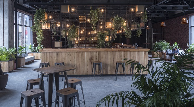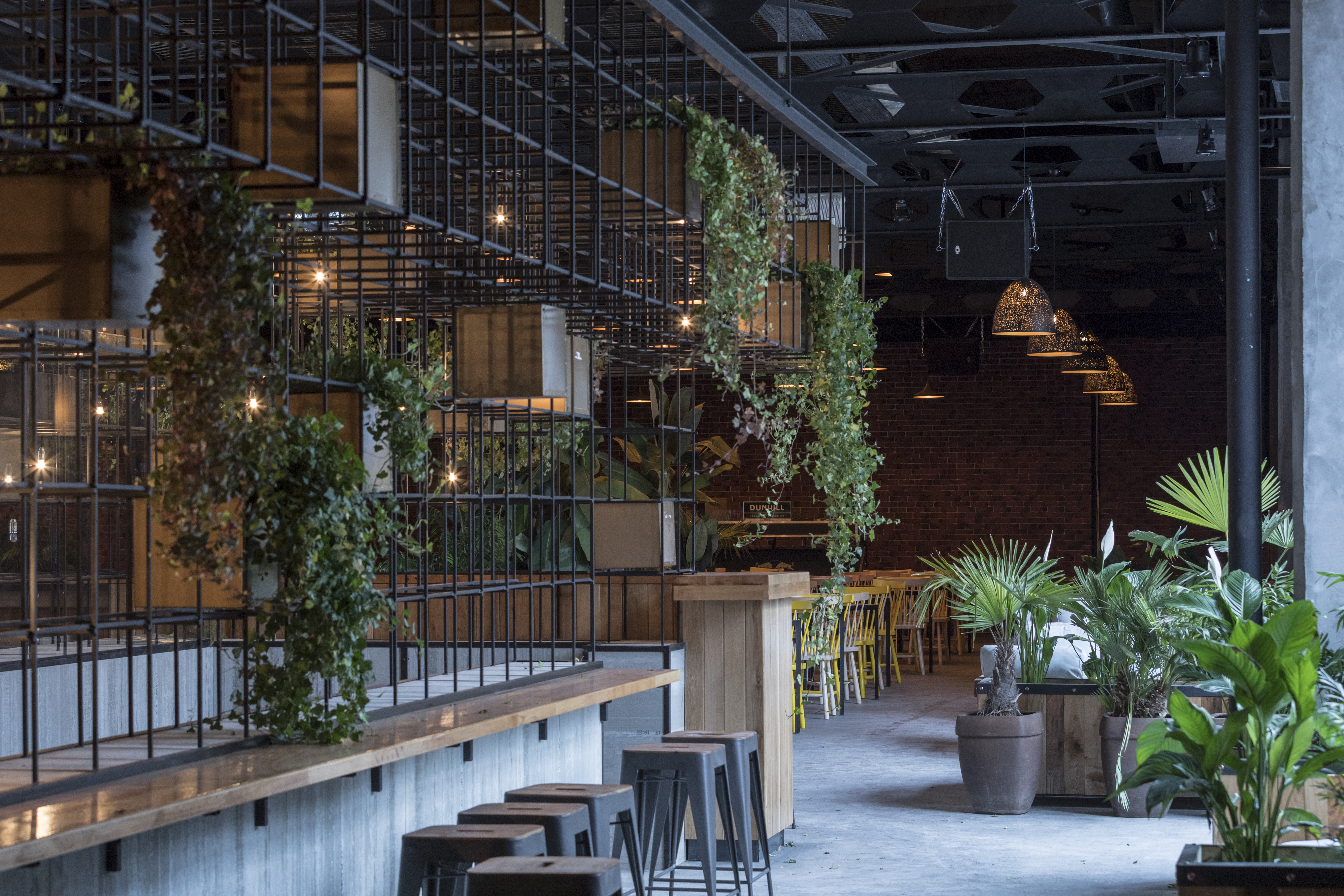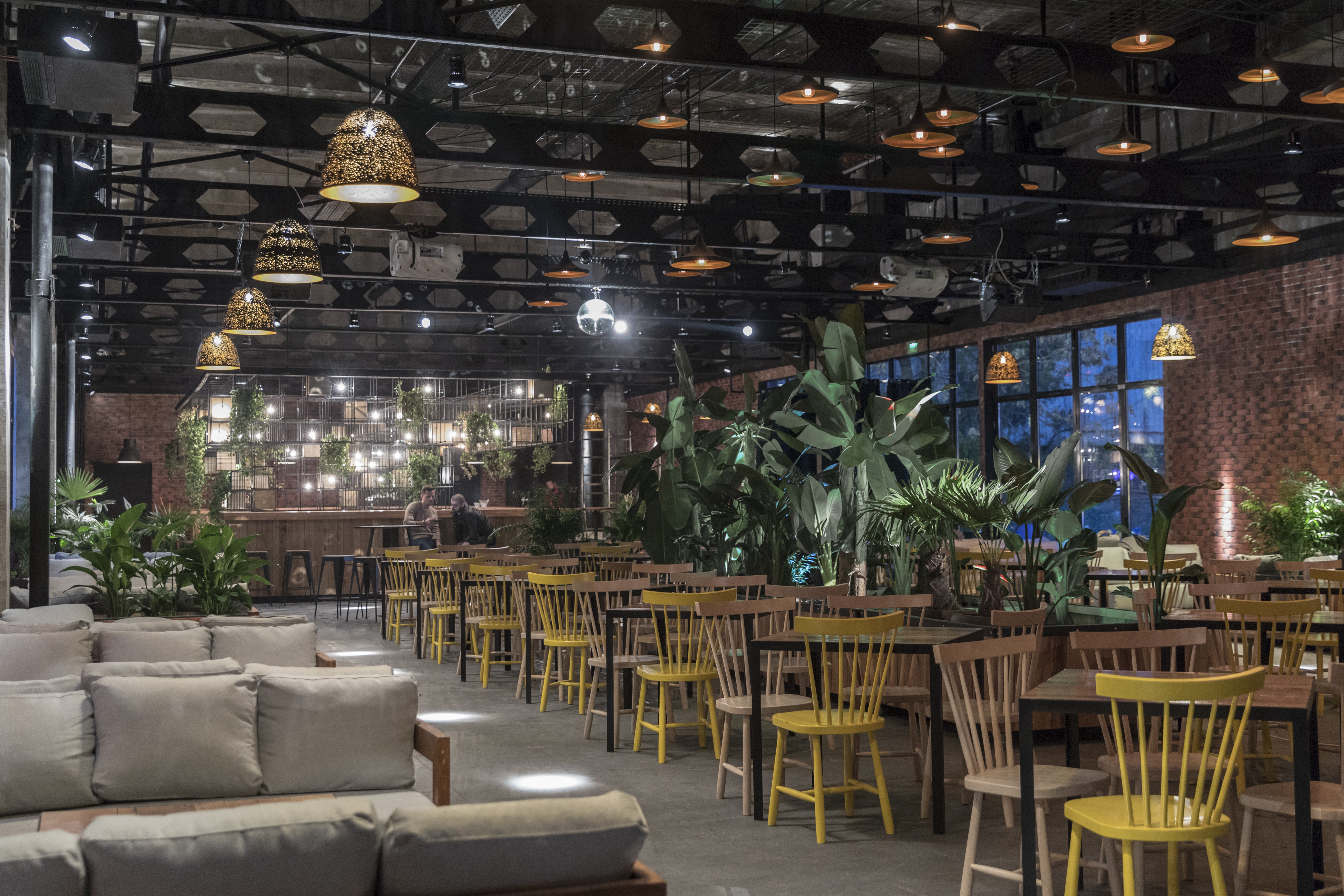 Nature was in full process of reclaiming the space when we visited the first time. The concept was based on this image of the old industrial hall flooded with vegetation. The interior space is divided into two major zones, the bar area and the open space/table area which can work independently. The gla tzed portion of the hall is towards the exit to theerrace to facilitate an easier access to the exterior, where the food court can be found during summer. The bar stands in the center of this area and is transparent to better filter the image of the courtyard.