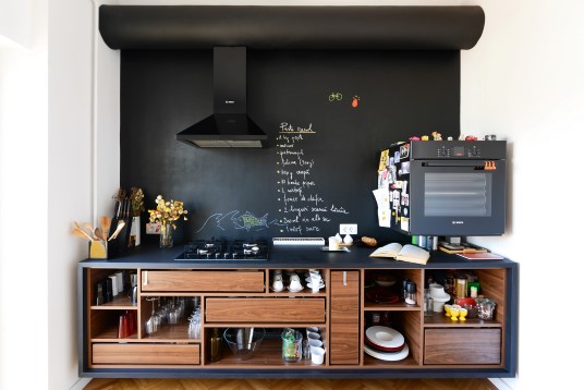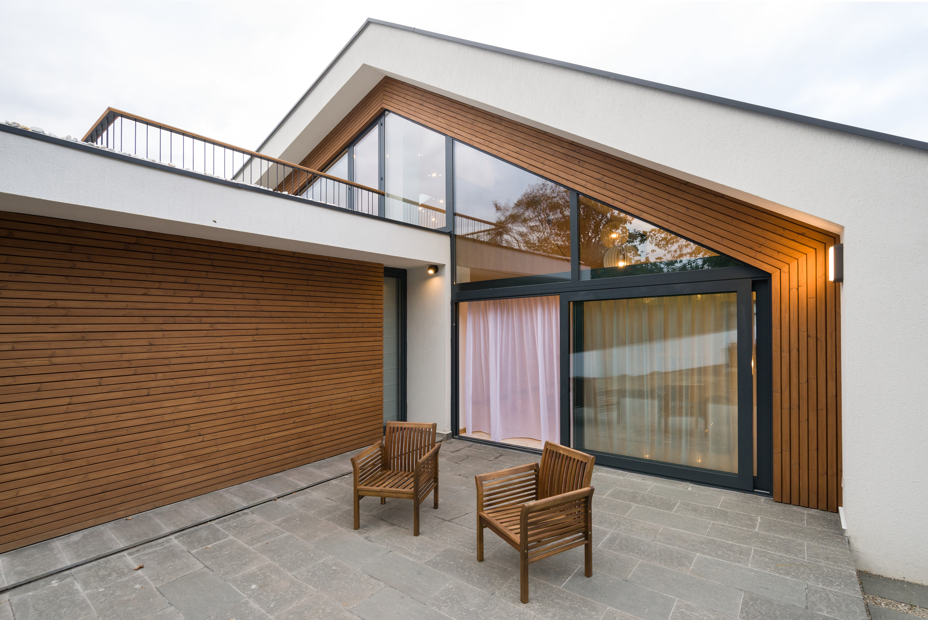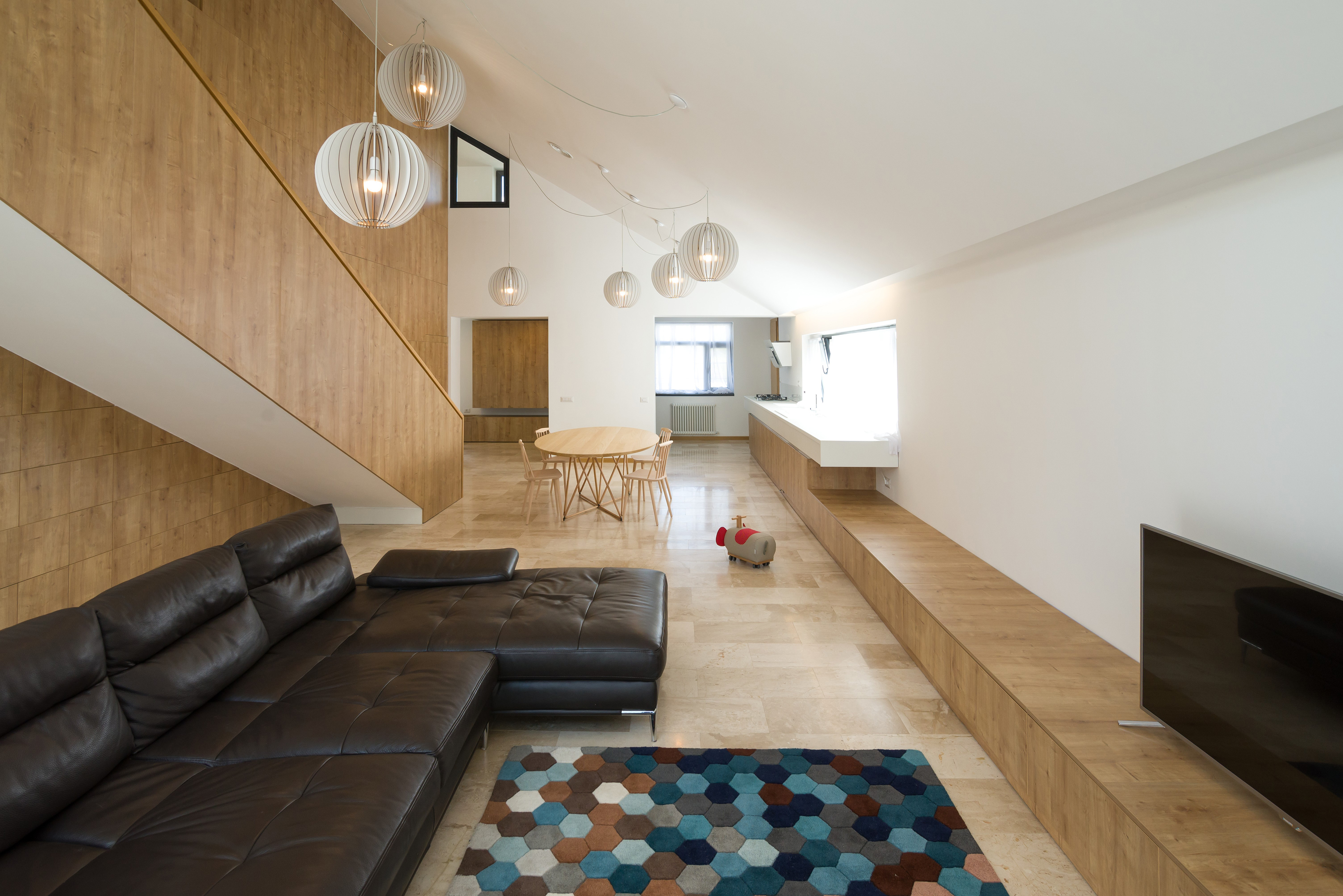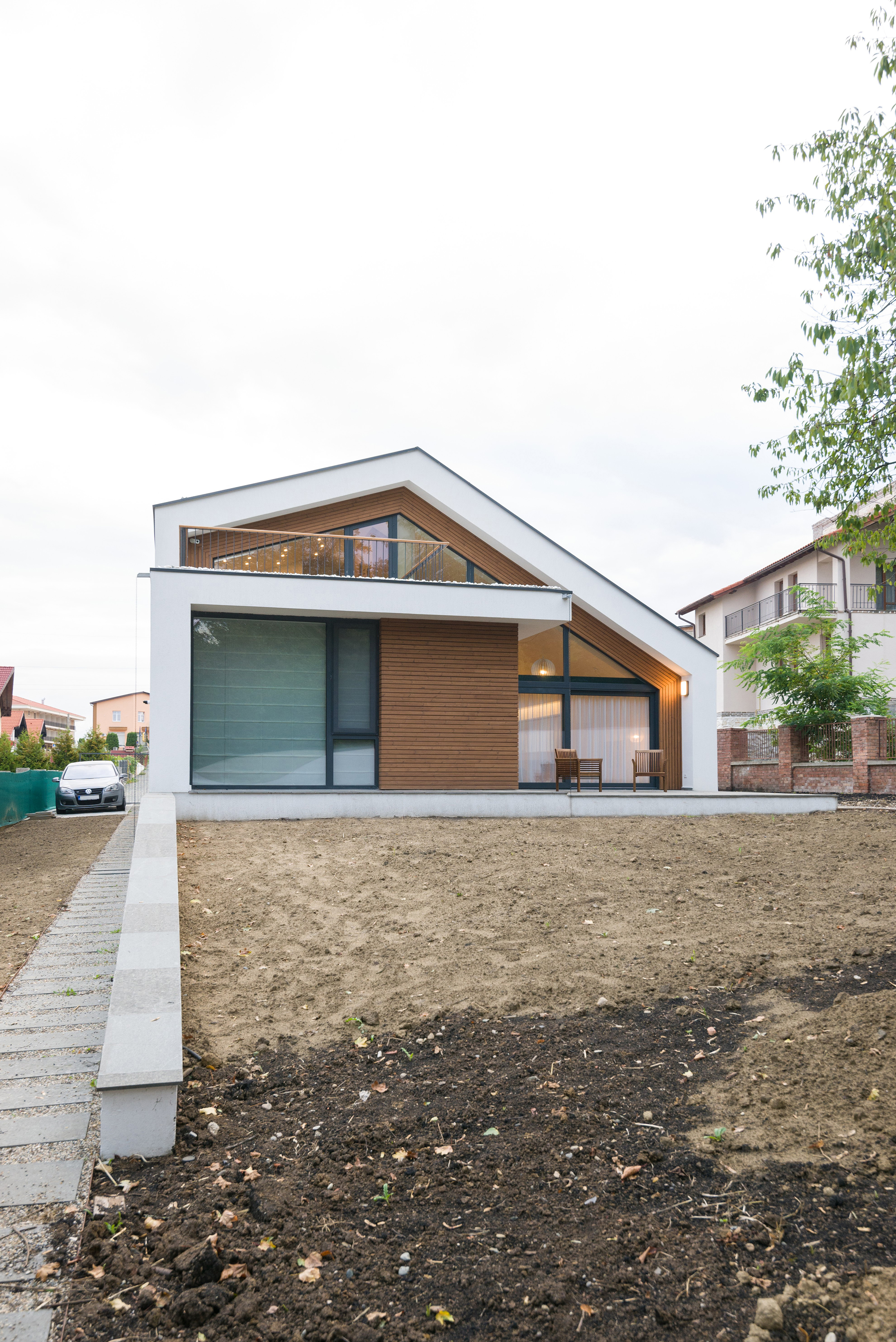 The relationship with the street is mediated by a facade dominated by a dent announcing the entrance, a ‘carved’ entrance with the purpose of announcing the warmth of the house. The relationship with the garden is mediated by a glazed facade that transforms the living-room in an extension of the garden and vice versa. The interiors revolve around the ample living-room, a space that unfolds on two stories and thus intermediates the dialogue ground floor-second floor and house-garden.