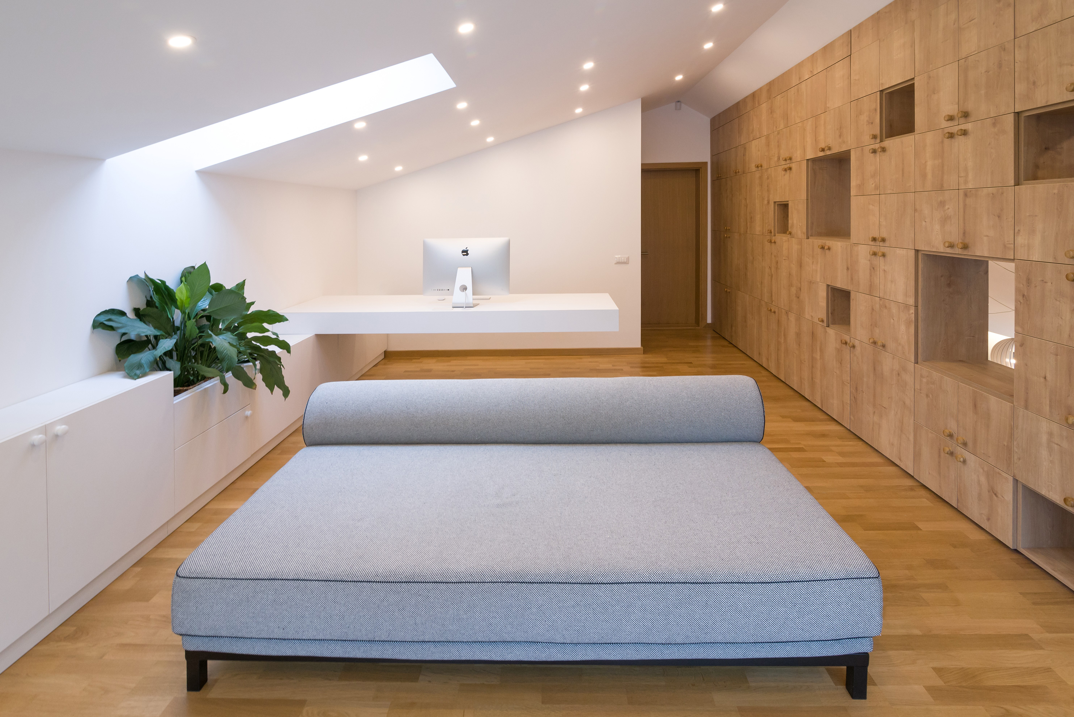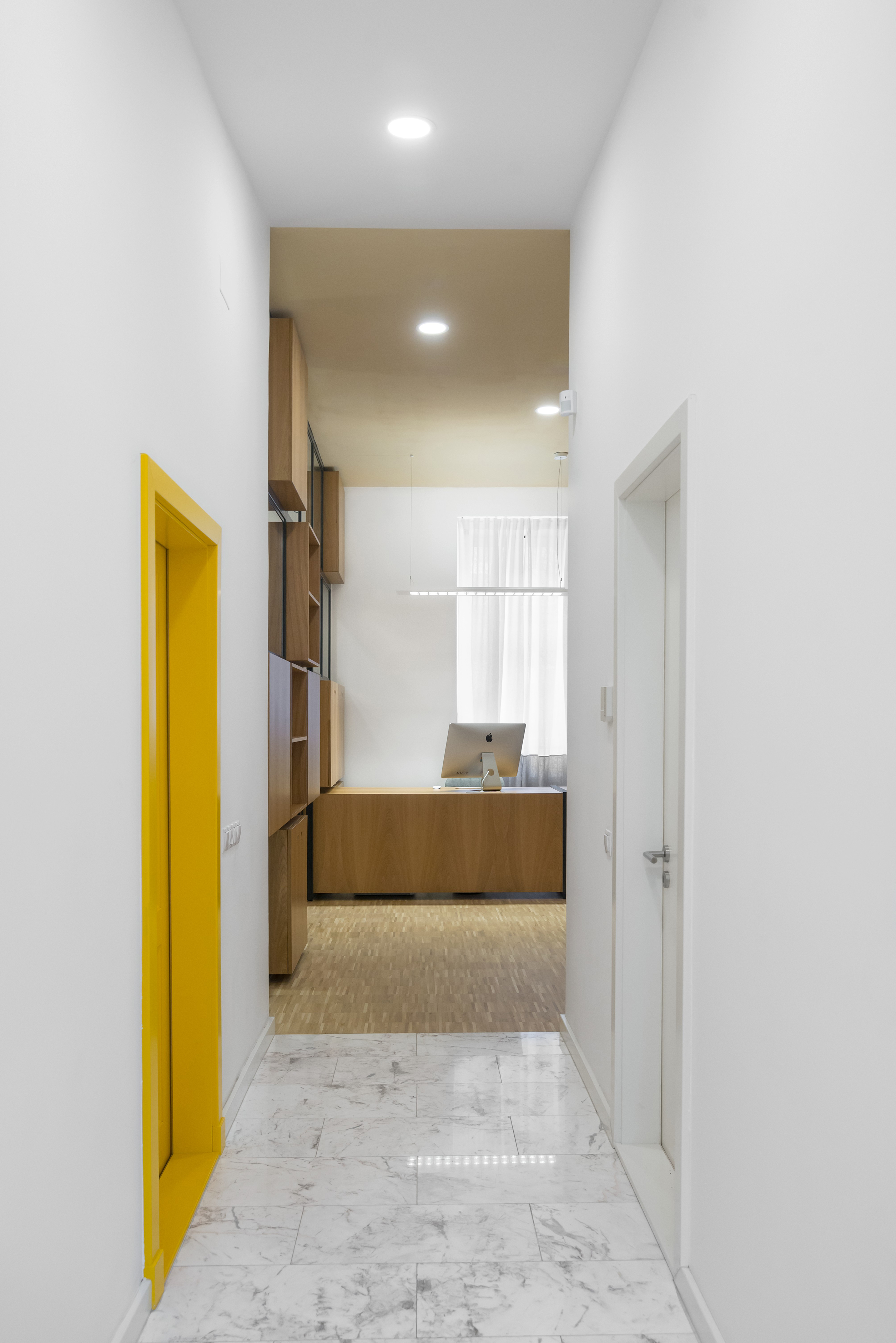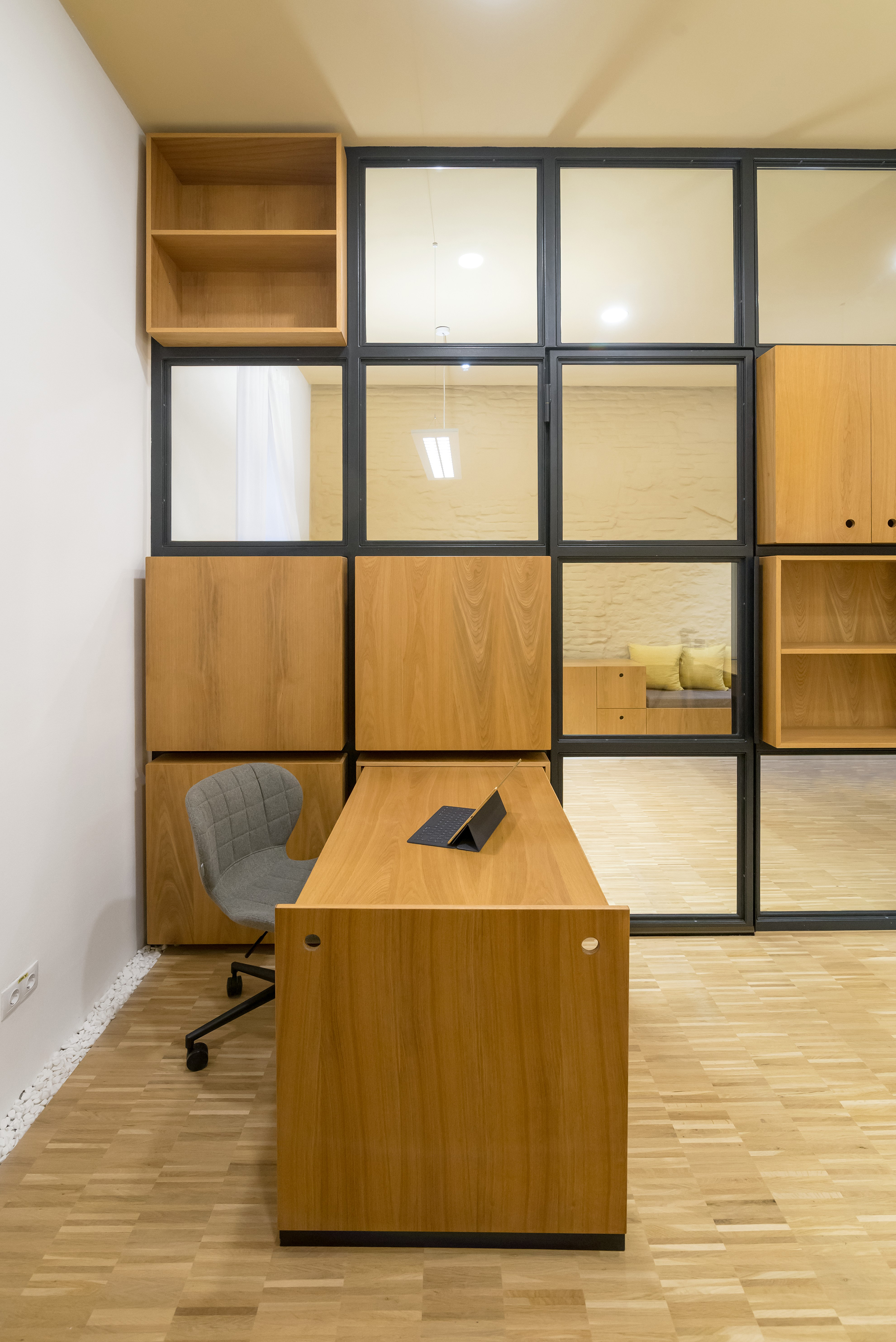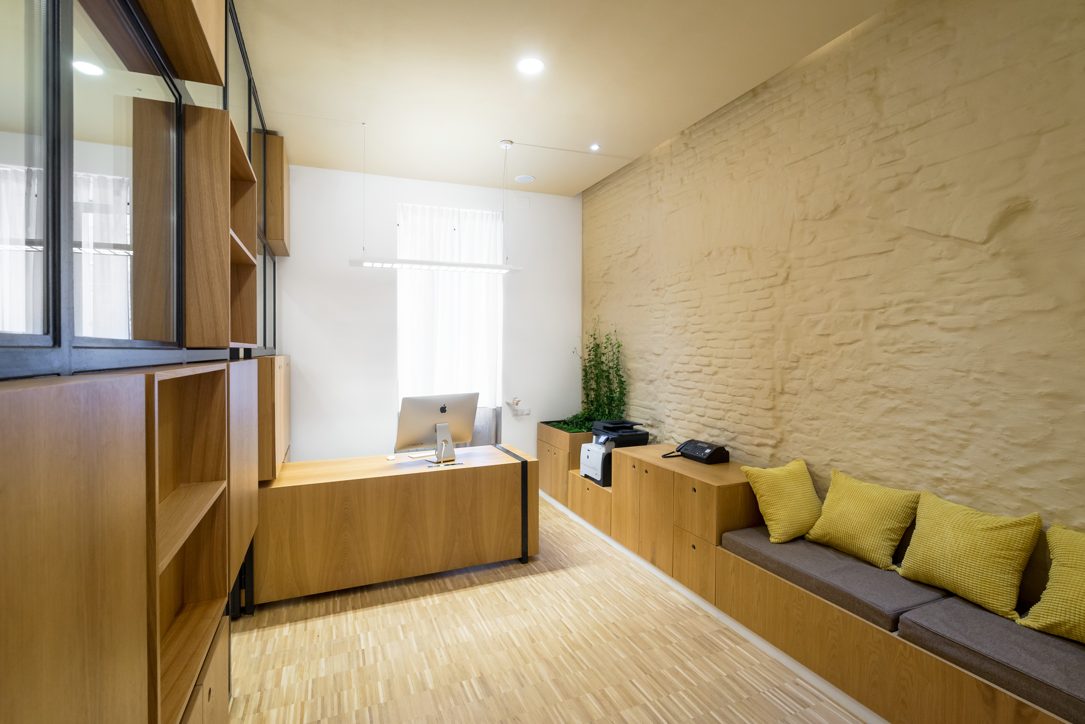 ALA Notary’s Office ambition is to differ from the usual desired opulence of one’s typical notary and law office interior architecture. Its interior, dominated by simple yet elegant custom made oak veneered furniture, revolves around the partially glazed wall that separates the two main spaces of the program: the notary’s office and the waiting room. The glazed wall is pierced by storage boxes and by the secretary's desk which, if needed, extends intro the notary’s office in order to accommodate the typist.