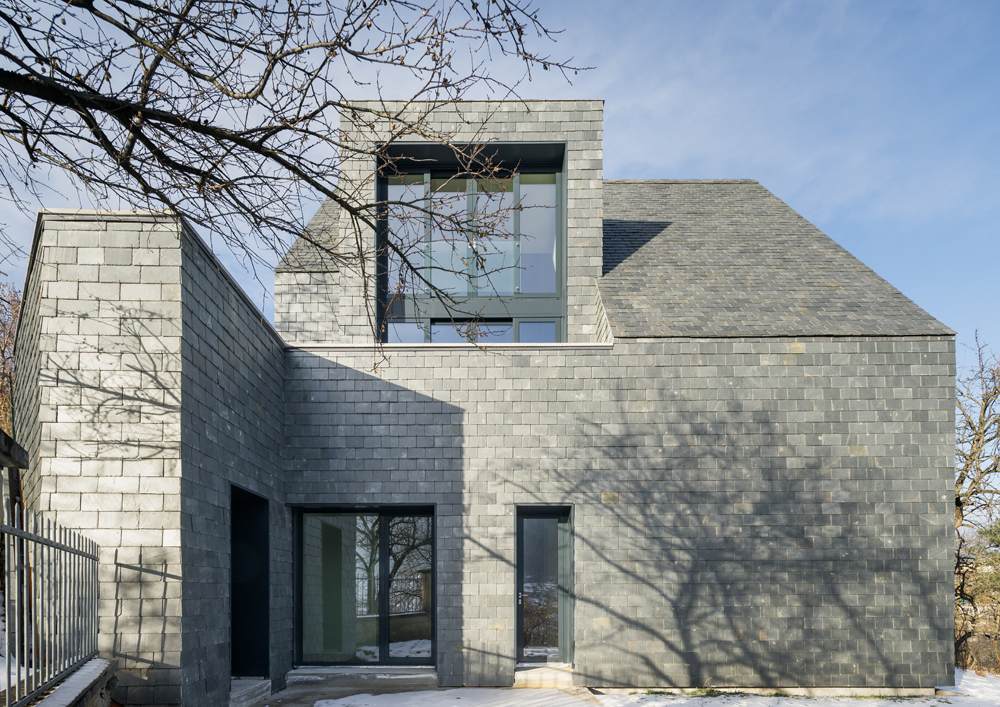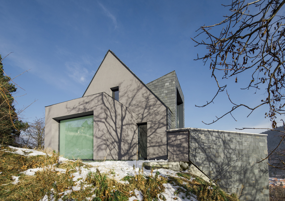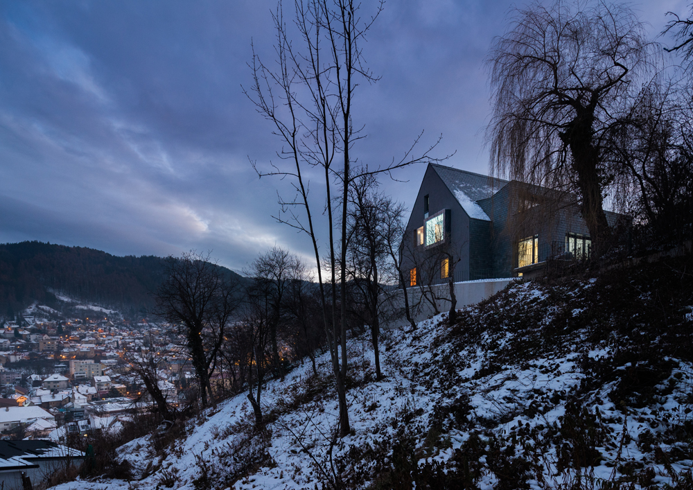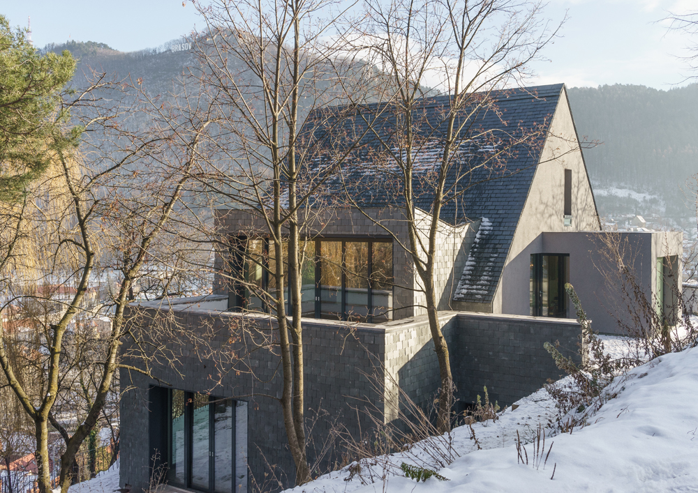 The house situated on a picturesque hill of Brasov, surrounded by mountains and with a unique panorama of the medieval city center, aims to bring a contemporary tribute to a lost early 20th century house, that once existed on this site. The house being visible from the city center, the goal was to define a discrete silhouette, that overlaps the natural background, and to use schematic finishings, such as slate, transforming the house in a model representing the quintessence of the memory of the old house.