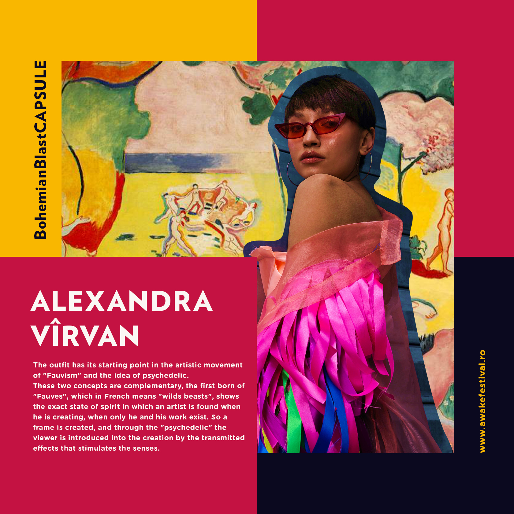 Primul designer BohemianBlast Capsule este Alexandra Vîrvan. Ținuta își are punctul de plecare în mișcarea artistică a „fauvismului" și ideea de psihedelic, conceptele acționând complementar. Fauvismul provine din cuvântul francez „Fauves" (trad.: ființe sălbatice) și arată starea exactă de spirit în care se găsește un artist când creează. Iar efectele psihedelice stimulează simțurile privitorului.