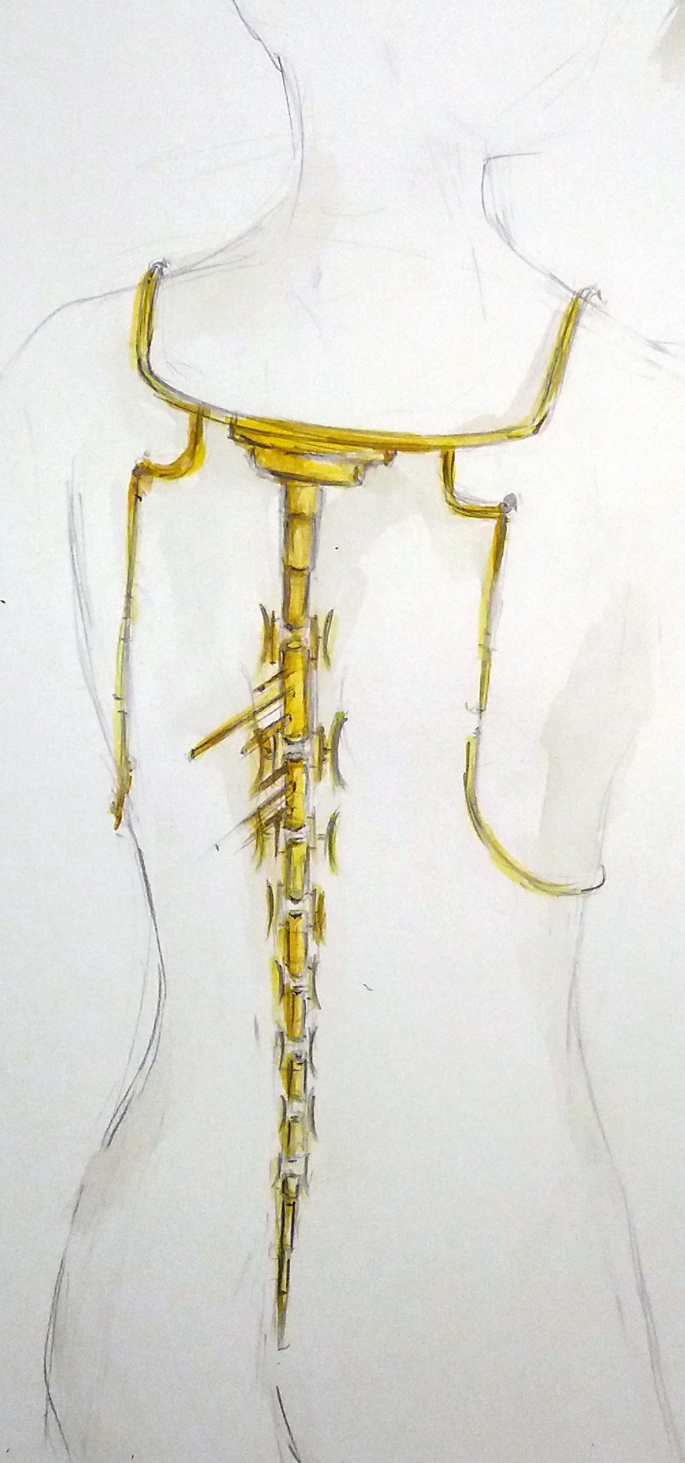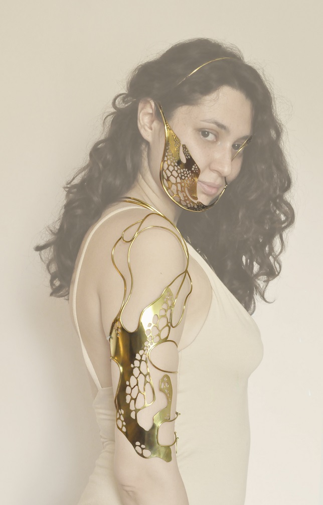 Lucrarea constă în două seturi de bijuterie de spectacol, realizate din alamă traforată (tablă și bară/țeavă), cu elemente mobile și sticlă inserată. Liniile simple dau impresia unui contur și pun în evidență elementul, iar traforurile dese, de diferite dimensiuni, ce alternează în funcție de așezarea pe corp și in relație cu întreaga piesă oferă ideea de transparență și lejeritate. Îmbinarea elementelor liniare cu cele complexe redau echilibru vizual pieselor.