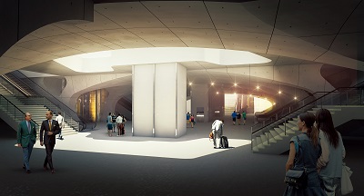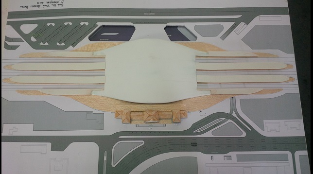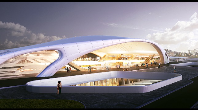 Astfel, proiectul propune poziționarea acestor mijloace de transport pe 3 nivele, circulația pietonală fiind verticală și scurtă către acestea. Forma rezultată fiind asemănată cu unda de val ce este formată de picătura de apa, care are un nucleu ce se răspândește în toate direcțiile planului.