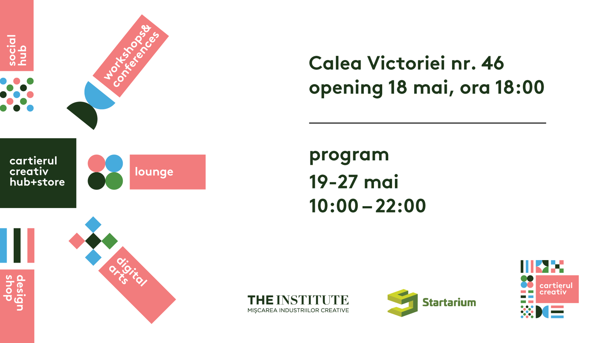 De asemenea, spațiul de la Victoria 46 va fi, pe toată perioada, gazda unui program dedicat industriilor creative și tinerilor antreprenori, ce va cuprinde conferințe, întâlniri și workshopuri organizate în parteneriat cu instituții și branduri ce împărtășesc aceleași valori cu cele ale Cartierului Creativ.