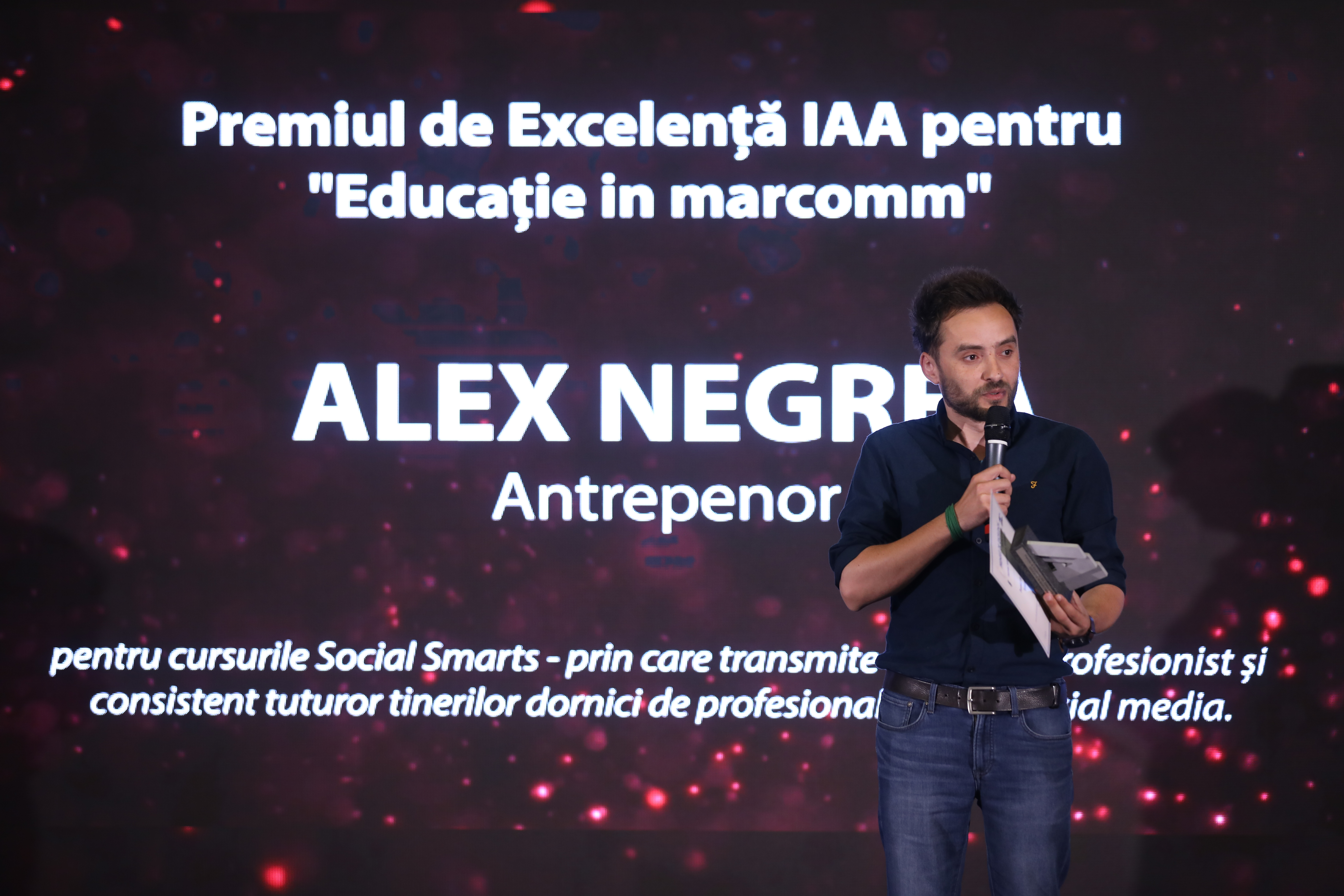 Premiul pentru Educație în Marcom a revenit în acest an lui Alexandru Negrea pentru cursurile și întâlnirile Social Smarts - prin care transmite conținut profesionist și consistent tuturor tinerilor dornici de profesionalizare în social media.