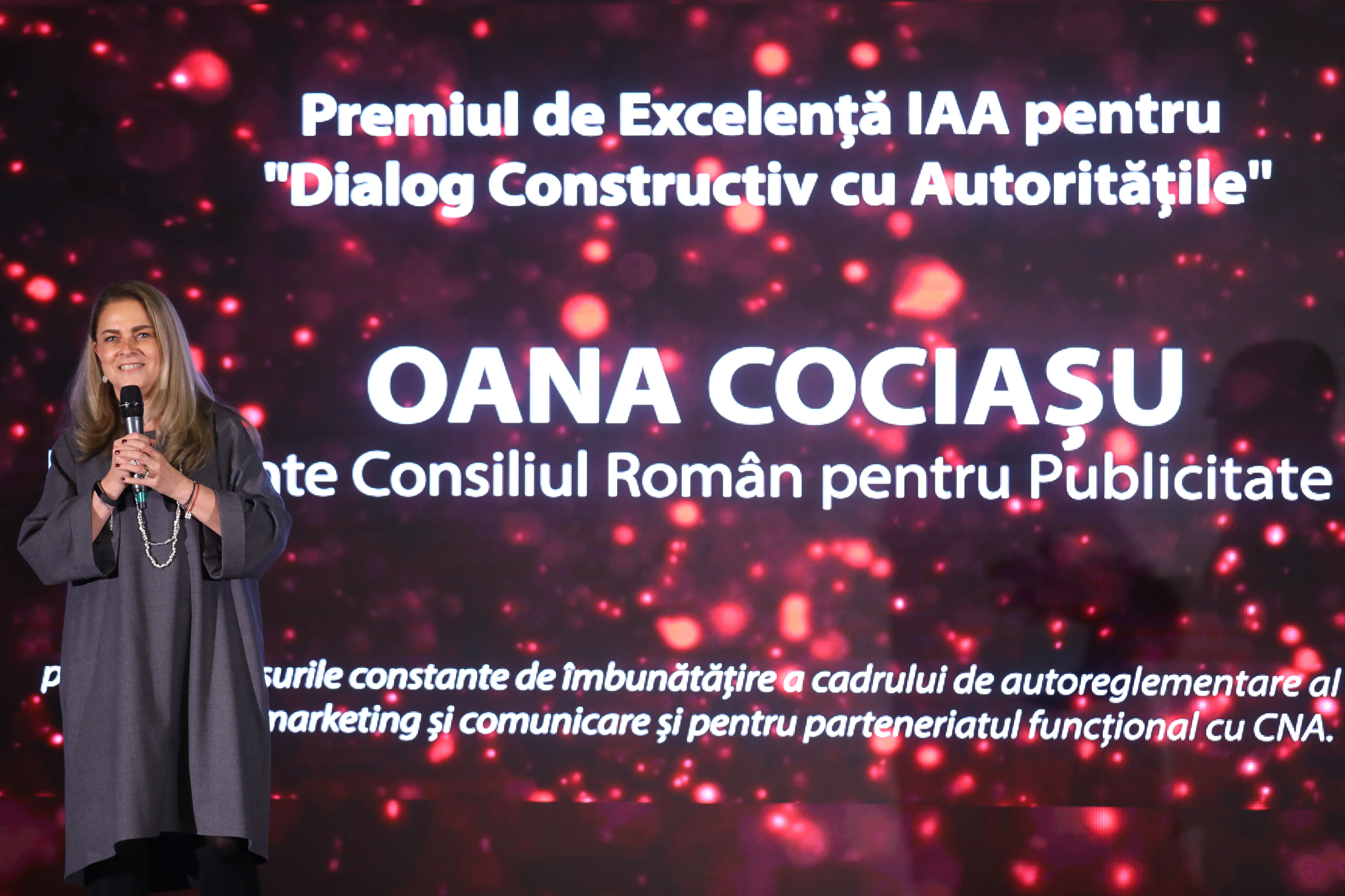 Premiul pentru Dialog Constructiv cu Autoritățile a fost acordat Oanei Cociașu - președinte RAC - pentru demersurile constante de îmbunătățire a cadrului de autoreglementare al industriei de marketing și comunicare și pentru parteneriatul funcțional cu CNA.
