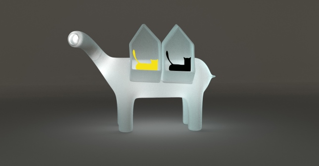 This is an imaginary object used for lighting but it can also be a bench, a mysterious place to store things or a cosy cats shelter. Hopa has a long neck because he wants to feed his curiosity and his experimental side.