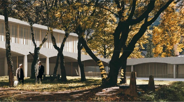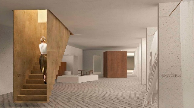 Mergând de-a lungul stațiunii, se poate remarca o continuitate spațială între edificiile construite care sunt legate printr-o secvență de portice, pasaje și poduri. Proiectul respectă această secvență, continuând circuitul în interiorul curții printr-un nou portic. Extinderea este împinsă până în limitele sitului, generându-și în acest fel forma particulară. Piesele principale ale extinderii definesc caldariumul, tepidariumul și frigidariumul și sunt poziționate structural, în timp ce alte camere sunt plasate non-ierarhic definind spațiul din jurul lor ca mici locuri de socializare. Noile băi termale și restaurantul propus primesc și un acces separat din piața care se formează în spatele sitului.