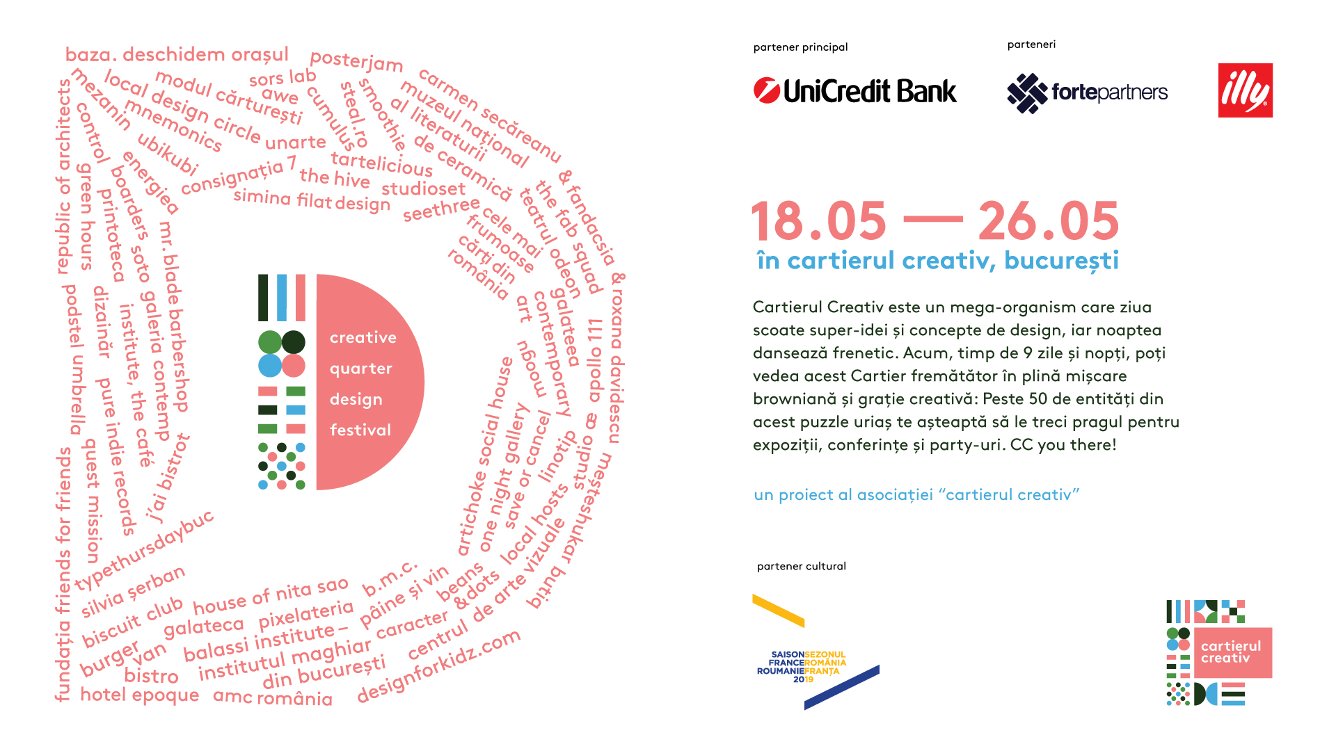 Asociația Cartierul Creativ organizează în perioada 18-26 mai 2019 Creative Quarter Design Festival, primul mare festival al cartierului din vecinătatea Parcului Cișmigiu, inspirat de UniCredit Bank. În acest context, entitățile din Cartierul Creativ propun peste 60 de evenimente speciale, de la expoziții, workshop-uri și talk-uri la tururi ghidate, performance-uri live, petreceri, treasure hunt, movie night și chiar un design market, care vor trasa programul și harta primului festival care sărbătorește efervescența creativă contemporană.