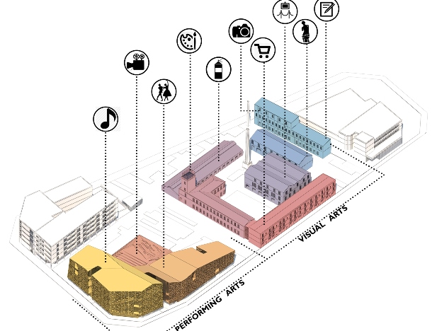 Centrul de artă propus este fragmentat în două ramuri: arte vizuale – adăpostite în fosta fabrică și artele spectacolului – adăpostite într-un volum nou propus, aflat în echilibru cu țesutul urban industrial înconjurător.
