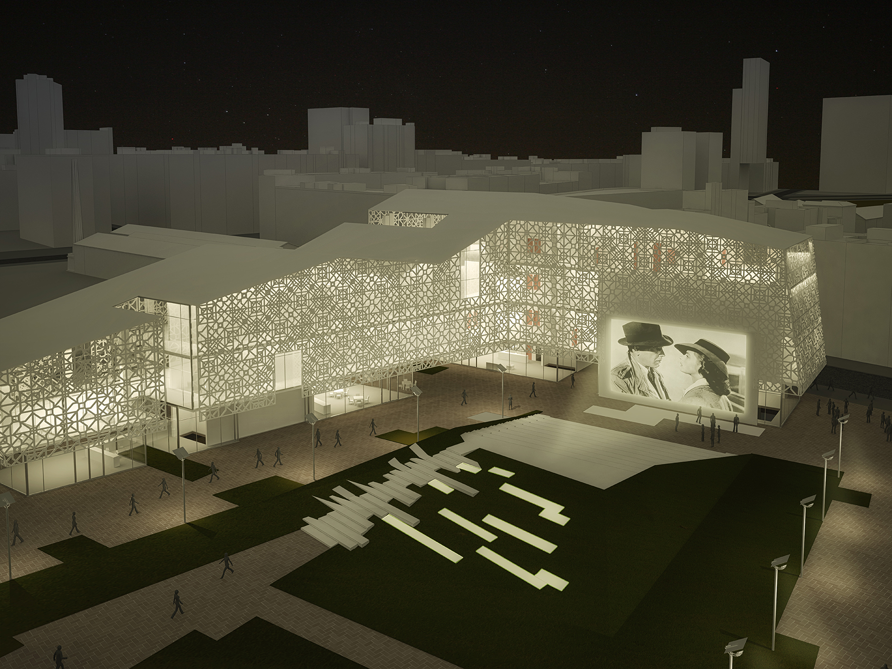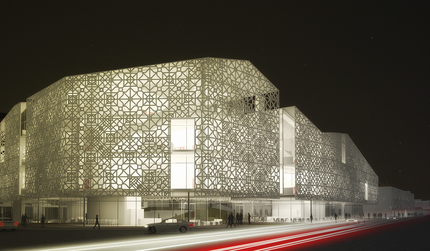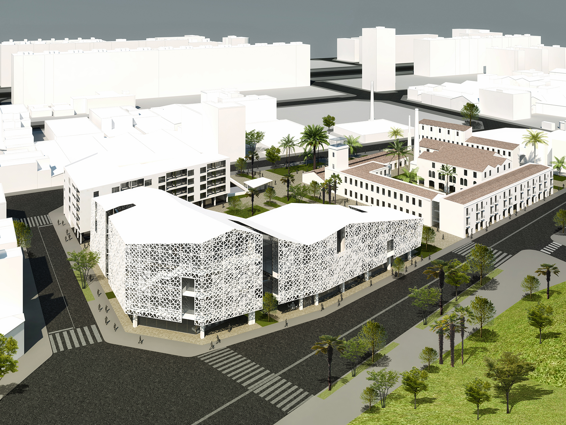 Din punct de vedere volumetric, am propus un corp de clădire nou, care să se subordoneze țesutului existent, amintind de siluetele vechilor fabrici ce dominau zona. Fațada tip ”double skin” prezintă un model realizat prin reinterpretarea formelor geometrice ale plăcilor ceramice spaniole tradiționale.
