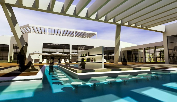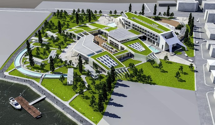 Amplasamentul se găsește pe Șoseaua Străulești la intersecție cu Intrarea Străulesti și Strada Santiago, pe malul Lacului Băneasa, în spatele Casei Presi Libere. Proximitatea lacului Băneasa a influențat organizarea clădirilor propuse și a contribuit la valorificarea terenului și a întregului complex. Clădirile sunt amplasate pe axa vest - est, orientate către lac, având accesul principal din Strada Străulești, iar cel secundar din Strada Santiago. Pentru o bună organizare s-au propus trei clădiri cu funcțiuni diferite. Primul corp, cel mai înalt, este destinat cazării pentru că oferă o perspectivă plăcută asupra lacului și a zonei verzi. La parterul acestuia se află restaurantul și barul. Celelalte două corpuri sunt destinate total bazinelor și spațiilor de recreere.