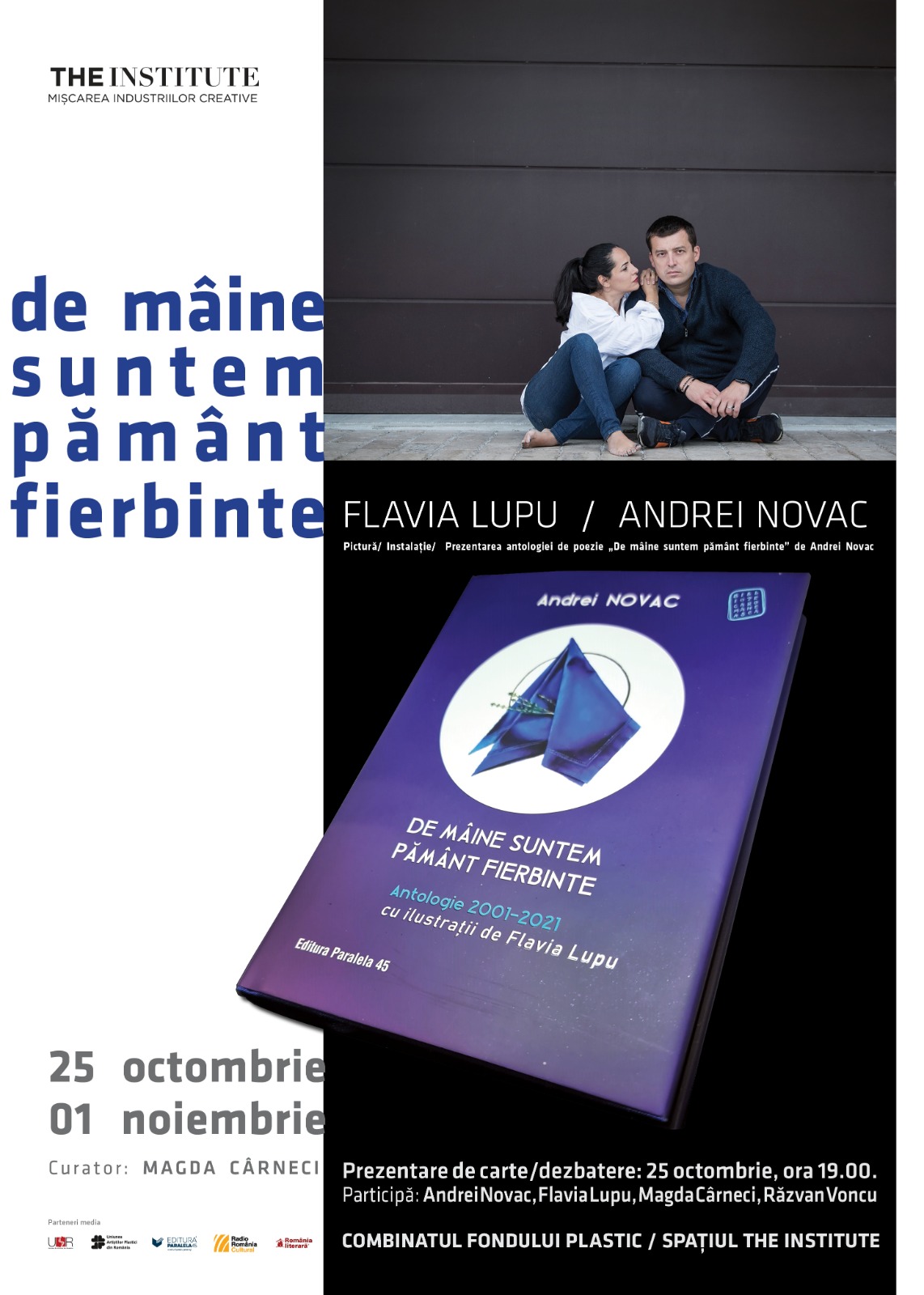 Spațiul The Institute găzduiește, începând cu 28 octombrie, expoziția curatoriată de Magda Cârneci „De mâine suntem pământ fierbinte”, eveniment care care a apărut ca o consecință a colaborării Flaviei Lupu cu poetul Andrei Novac pentru ilustarea antologiei acestuia, apărută la Paralela 45.