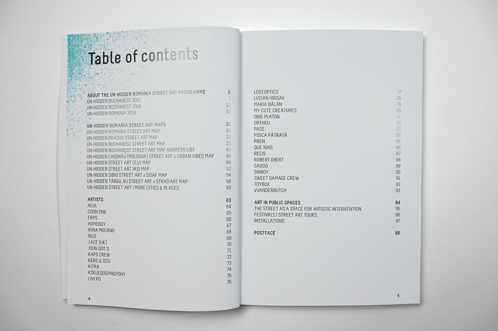 Un-hidden Street Art in Romania are ca scop umanizarea și promovarea cunoașterii orașelor din România și Moldova, propunând explorarea acestora prin intermediul artei urbane independente. Publicația prezintă intervențiile culturale Un-hidden Bucharest 2017, 2018 și 2019, co-finanțate de AFCN, care activează spații interesante sau uitate, cum sunt Sala Omnia, Lente, Cinema Marconi, Facultatea de Sociologie și Asistență Socială, Dizainăr, clădirea Cina – spațiul M60, alături de artiști remarcabili, producând un traseu ghidat și o hartă print & online care mapează peste 200 de intervenții artistice independente în spațiul public.