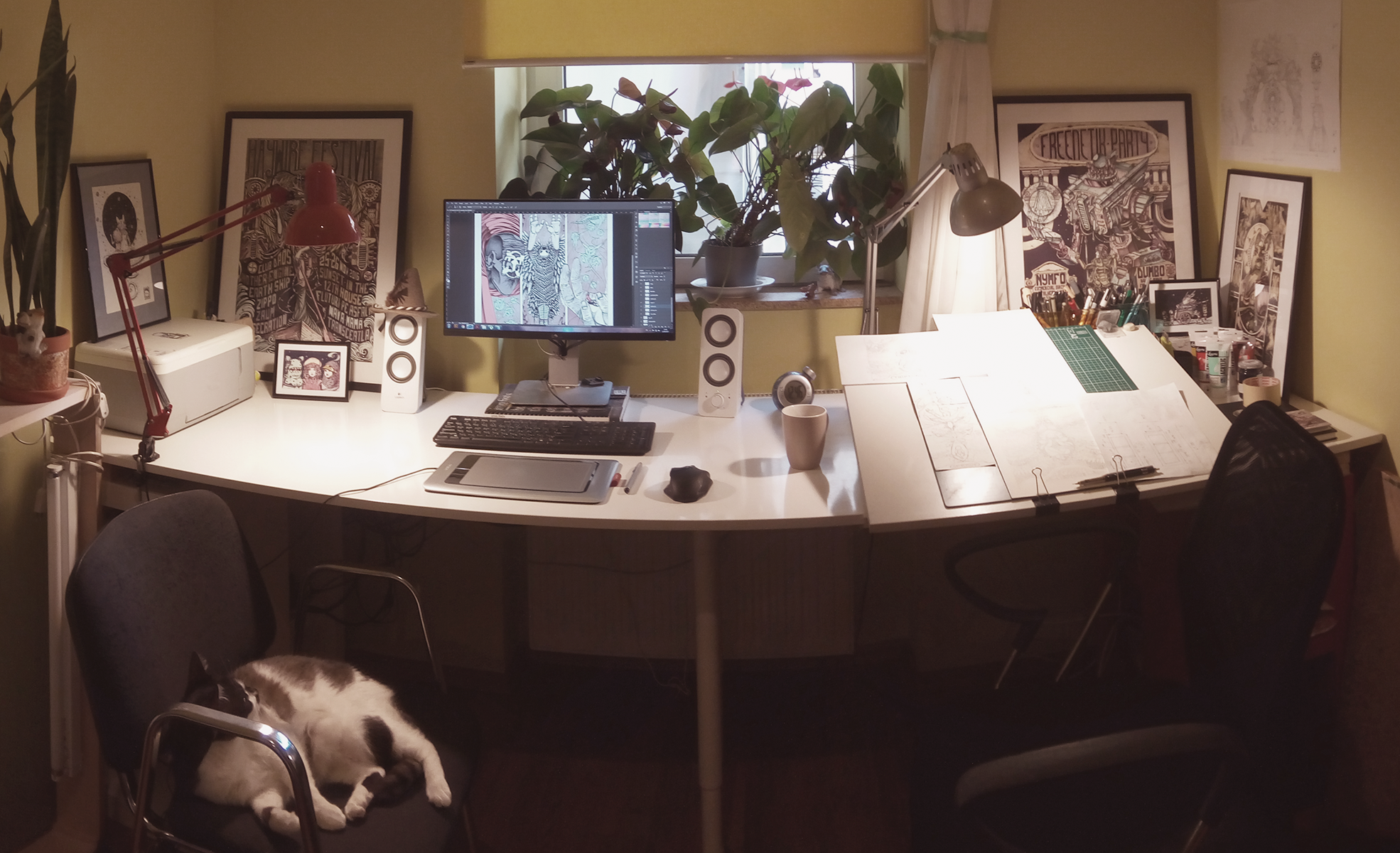 Complexitatea execuțiilor poate da impresia unei echipe numeroase de creativi mereu la lucru. În realitate, doi graficieni și o pisică sunt responsabili pentru toată magia.