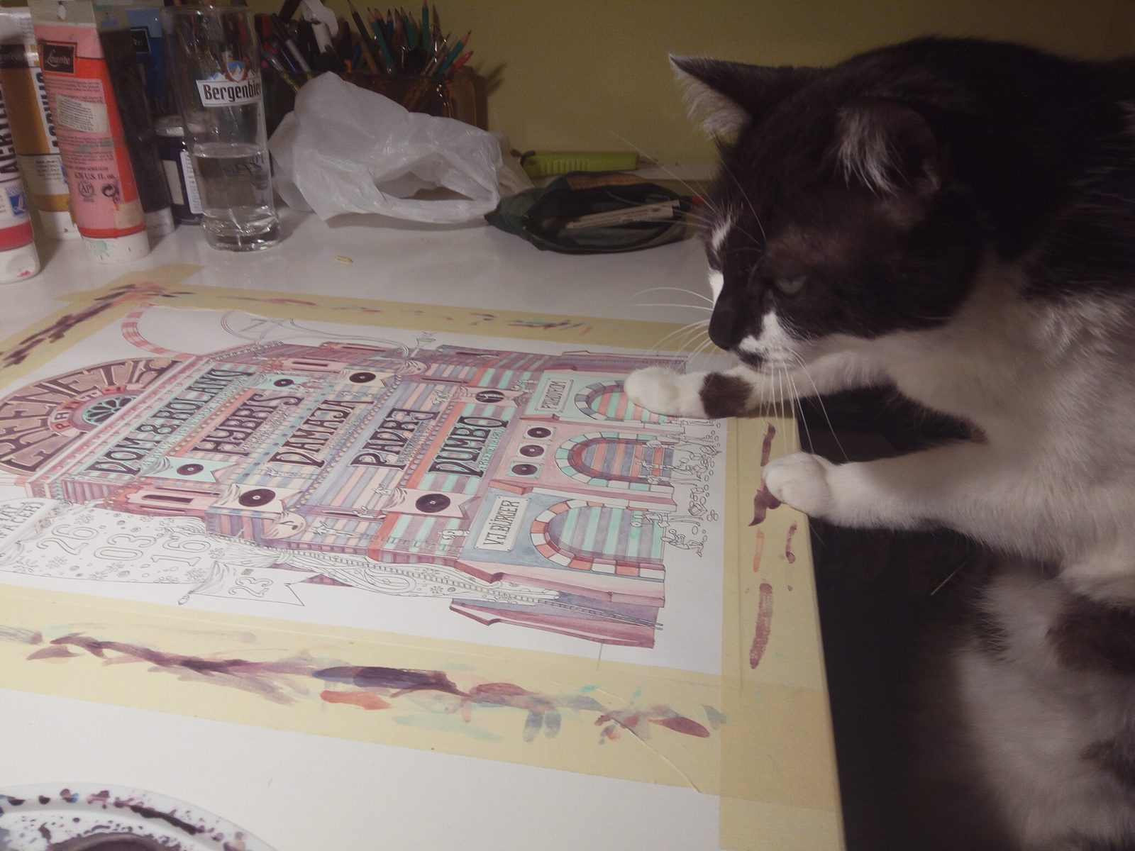 Așadar, prin octombrie 2013 am încercat să lucrăm în această formă. Am început cu câteva postere pentru diverse evenimente culturale și pe parcurs am tot ajuns să primim diferite alte comenzi (postere, desene de tricou, albume, viniluri, icoane pentru aplicații, decor de scene etc.). De atunci până în prezent am acceptat toate aceste provocări și intenționăm să ne ținem de treabă în continuare. Bineînțeles, ca orice om, avem și noi viața de zi și viața de seară, adică ziua lucrăm la proiecte, iar seara desenăm la benzile noastre desenate, când nu ieșim în oraș. Și așa trece timpul. De fapt, nici nu îți dai seama cum trece timpul.” - echipa Kape Illustration